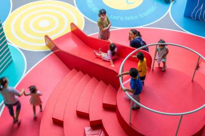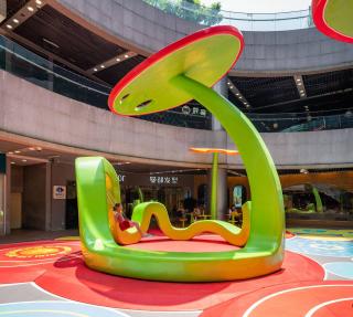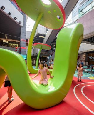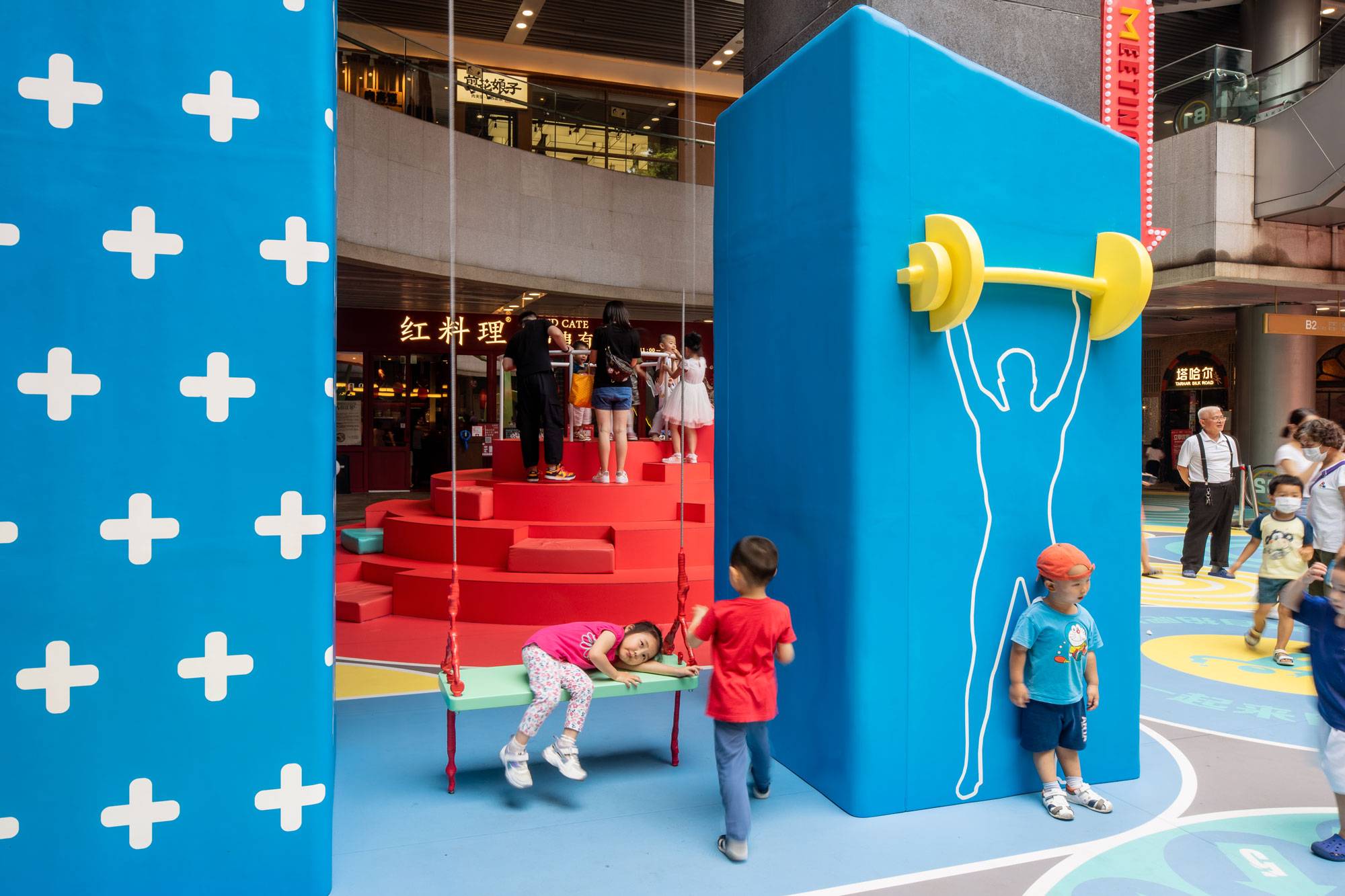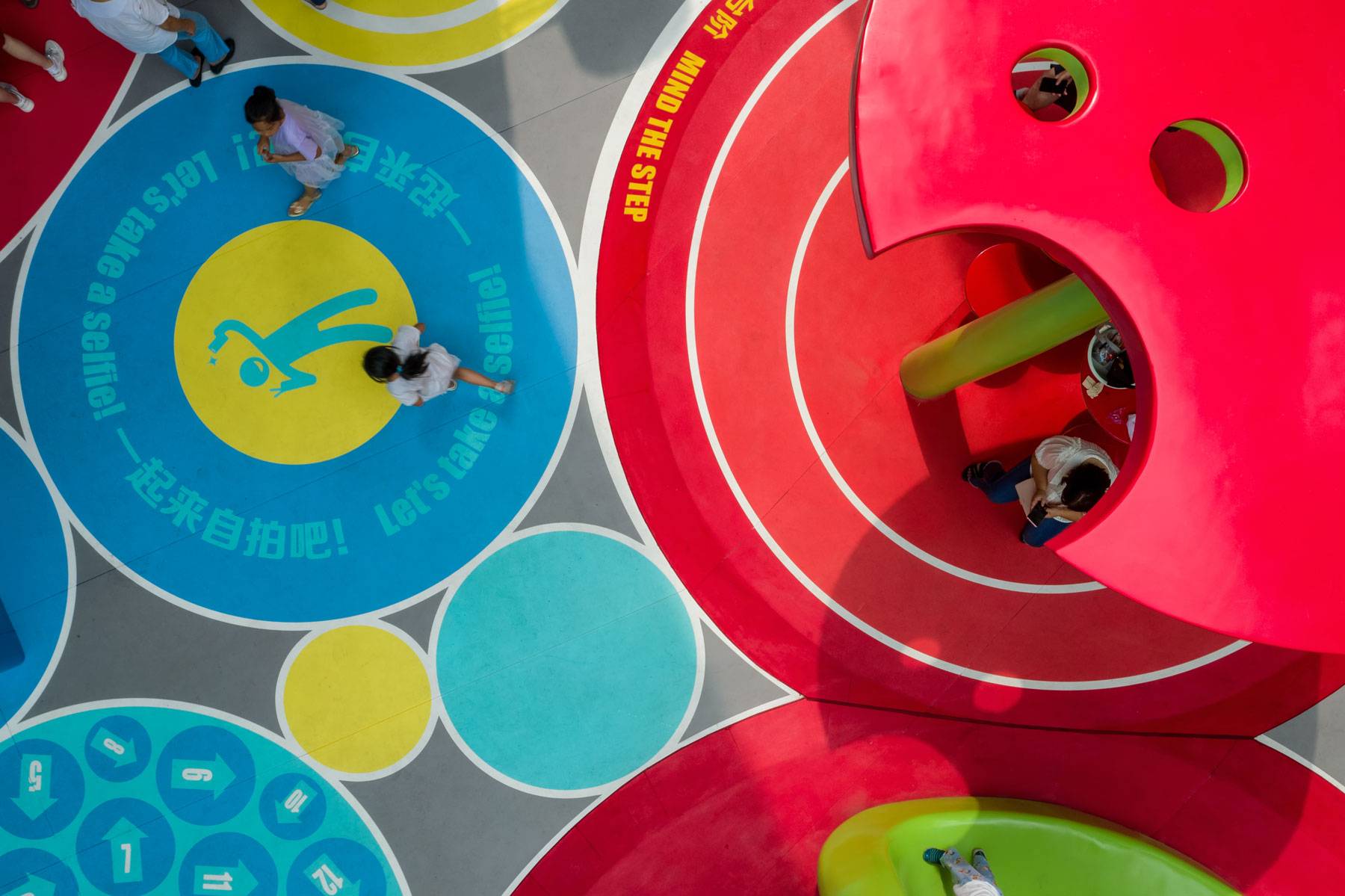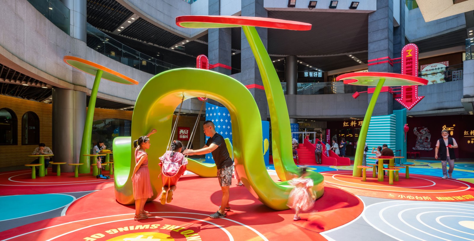 This revamp of this almost abandoned sunken plaza had as a main objective turning the grey and obsolete space into an eye-catching, bold and vibrant public space fostering social interactions, entertainment and a fun immersive experience below the surface of buzzy intersection streets in Minhang.