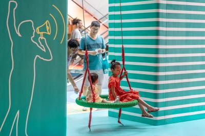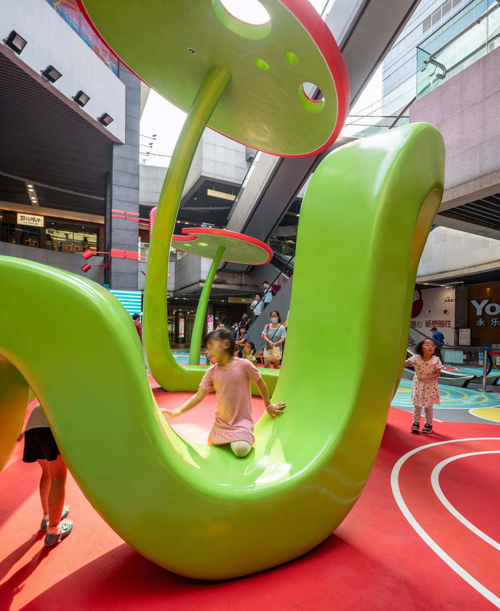 為了提升整個花園的體驗,讓游客沉浸其中,3朵超大的花朵拔地而起,在舒適的蔭涼下,充當(dāng)嬉戲和休息的平臺,供兒童和成人使用。