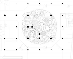 Many of those circles feature interactive games, graphics and messages in them, encouraging a functional and eventful activation of the floor and the space.