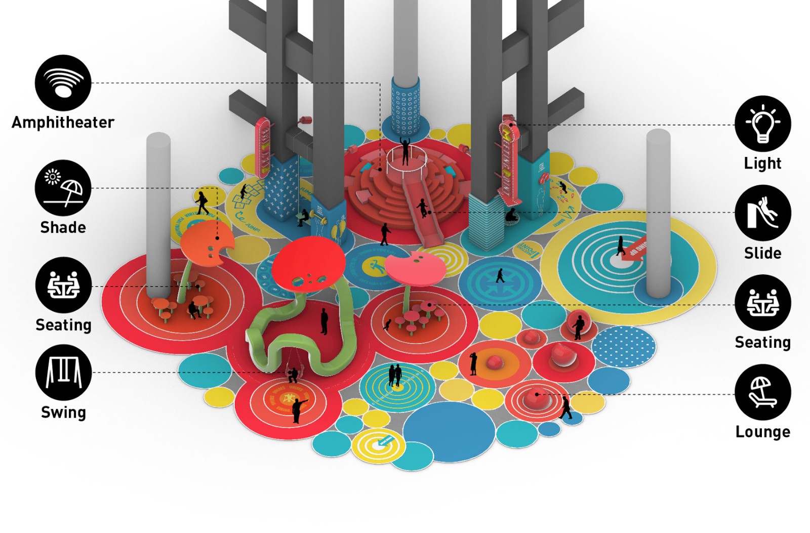 The project was conceptualized as if we had buried a seed in a colorless ground unleashing a colorful blooming explosion of life, gigantic flowers and entertainment features triggering the occurrence of this wonderful blooming garden.