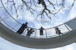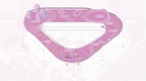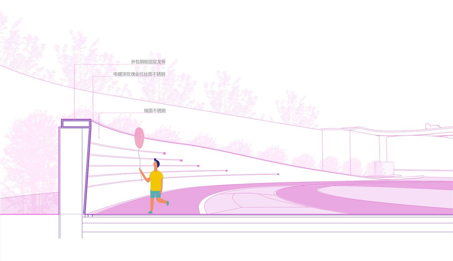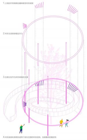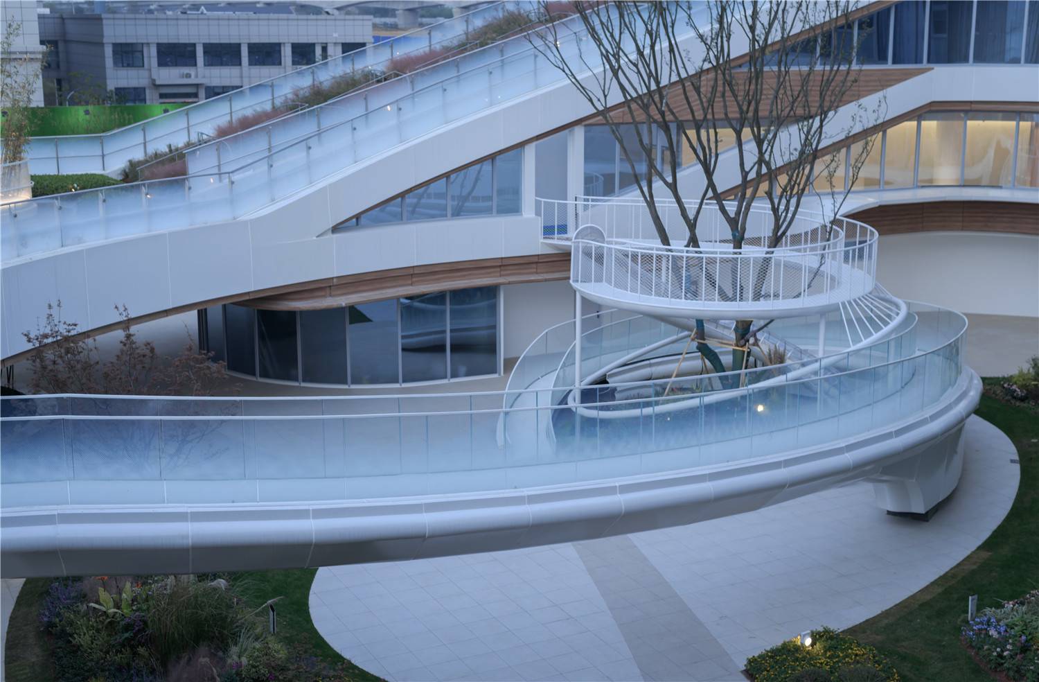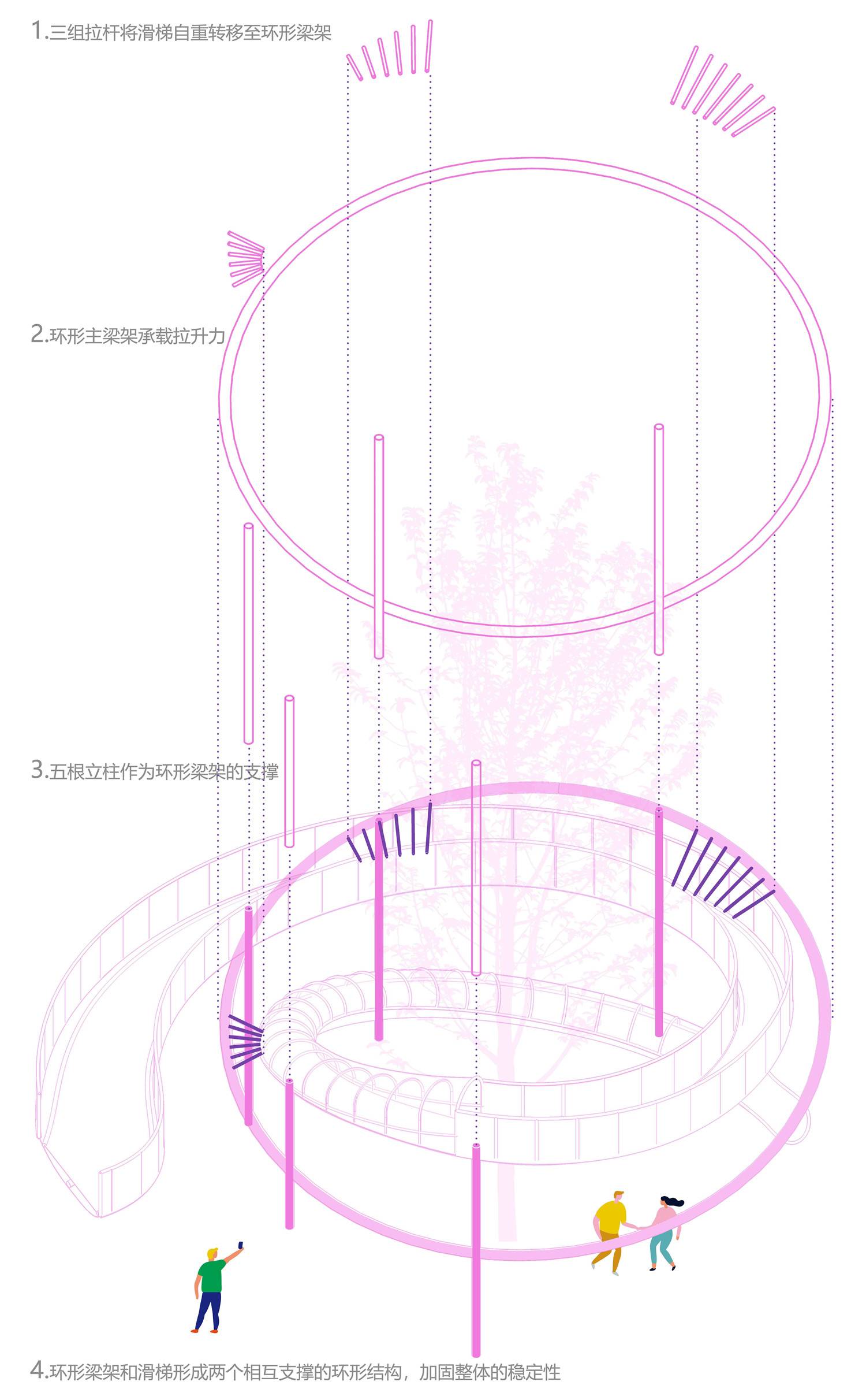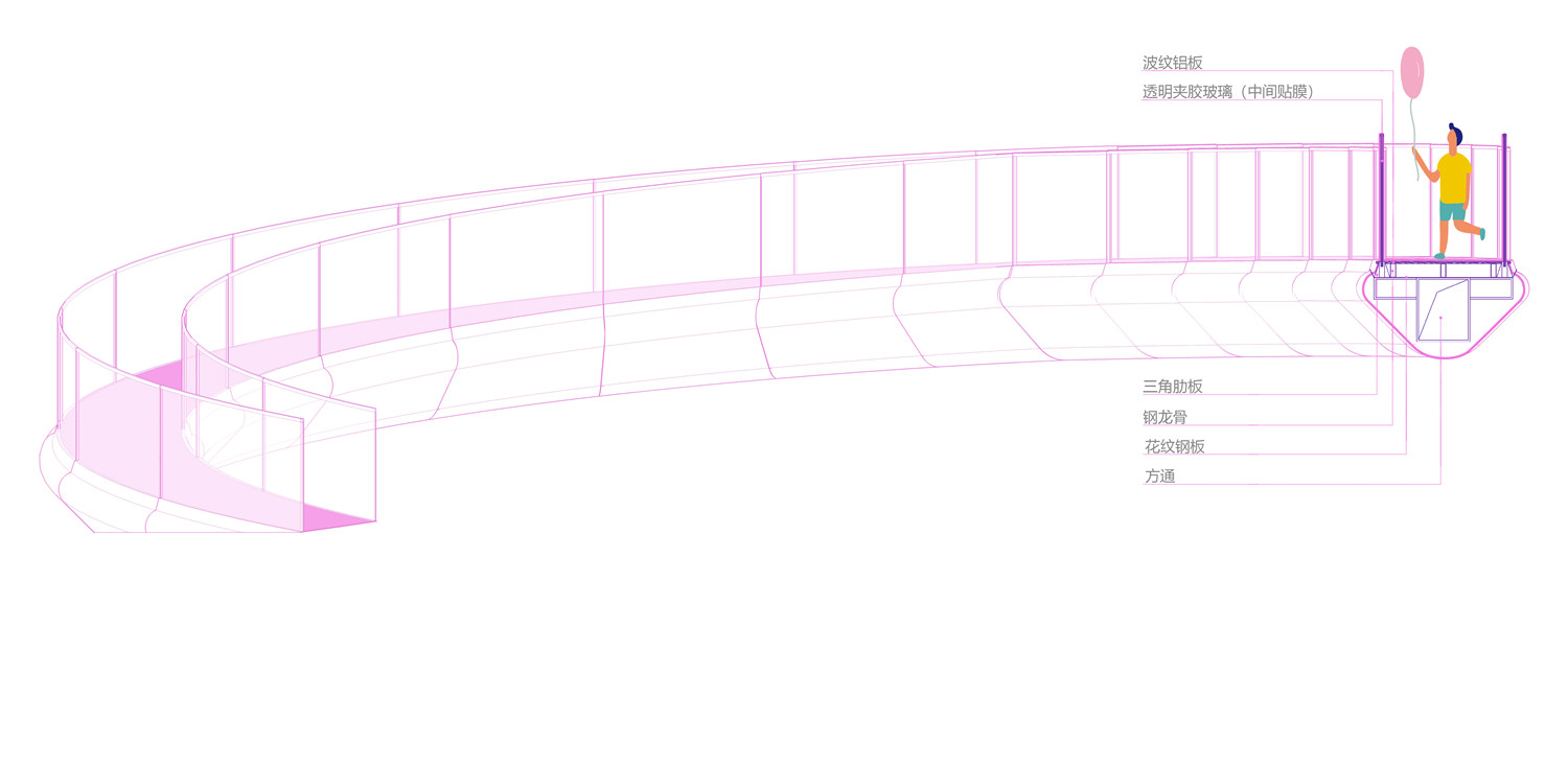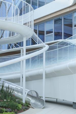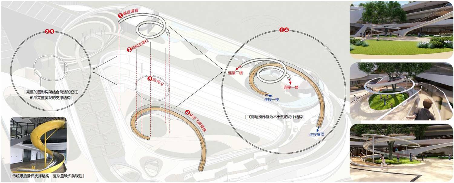 利用裝飾圓環(huán)與滑梯相互受力來減少穩(wěn)定滑梯所需要的立柱數(shù)量,最終呈現(xiàn)出更具螺旋視感的滑梯空間,與飛廊的交通體系相互搭接配合,形成了獨特的視覺感受。
