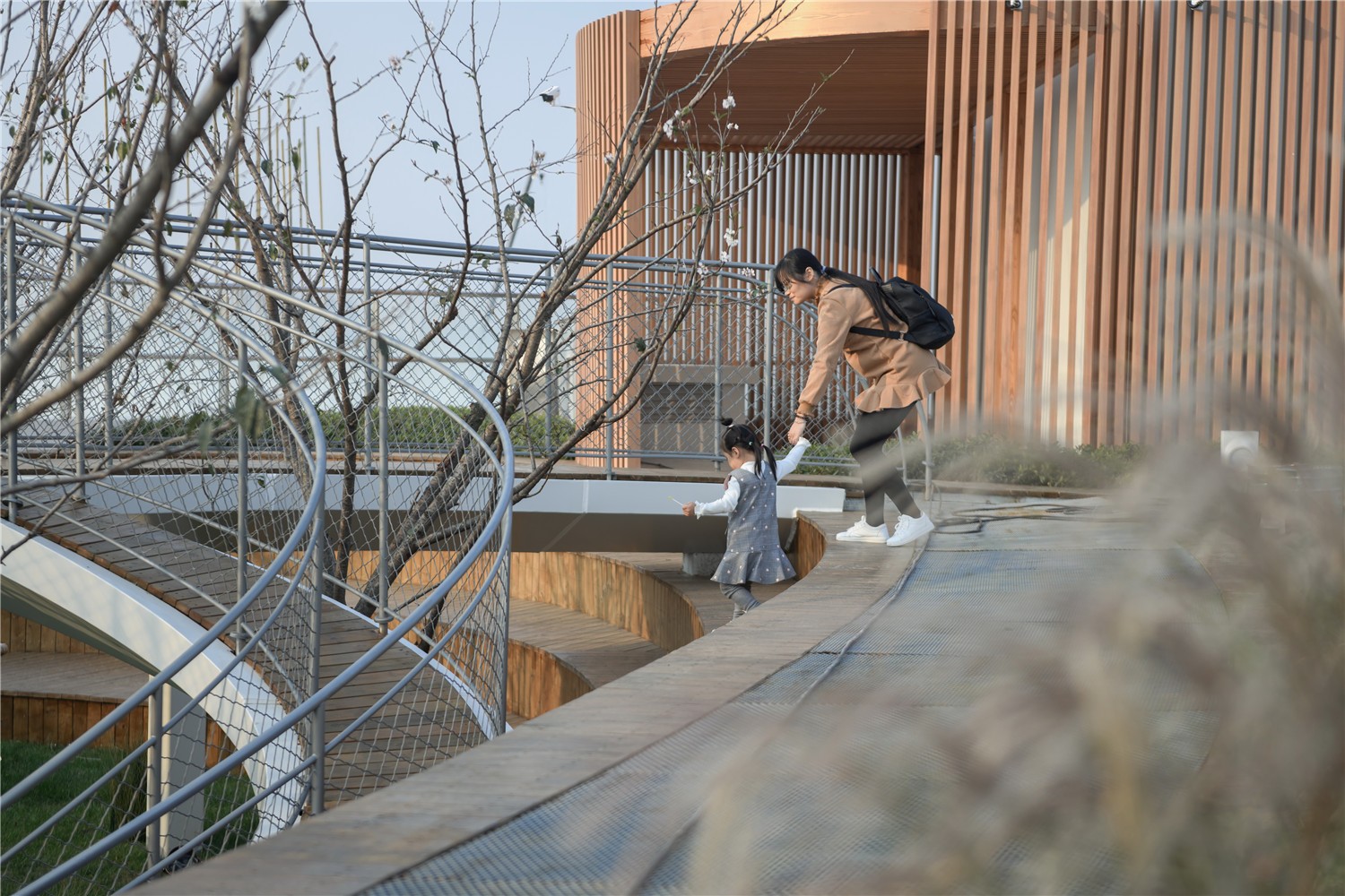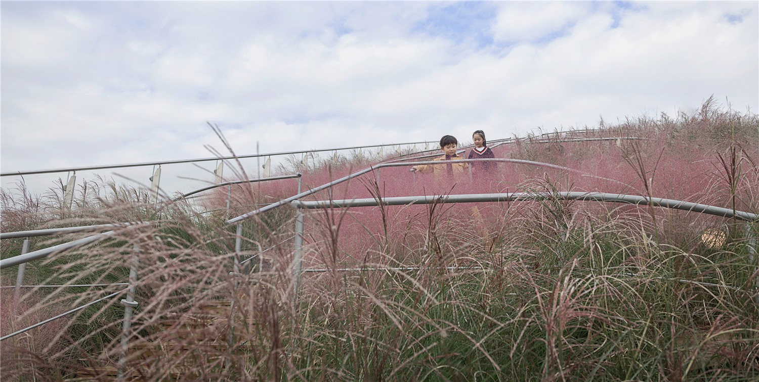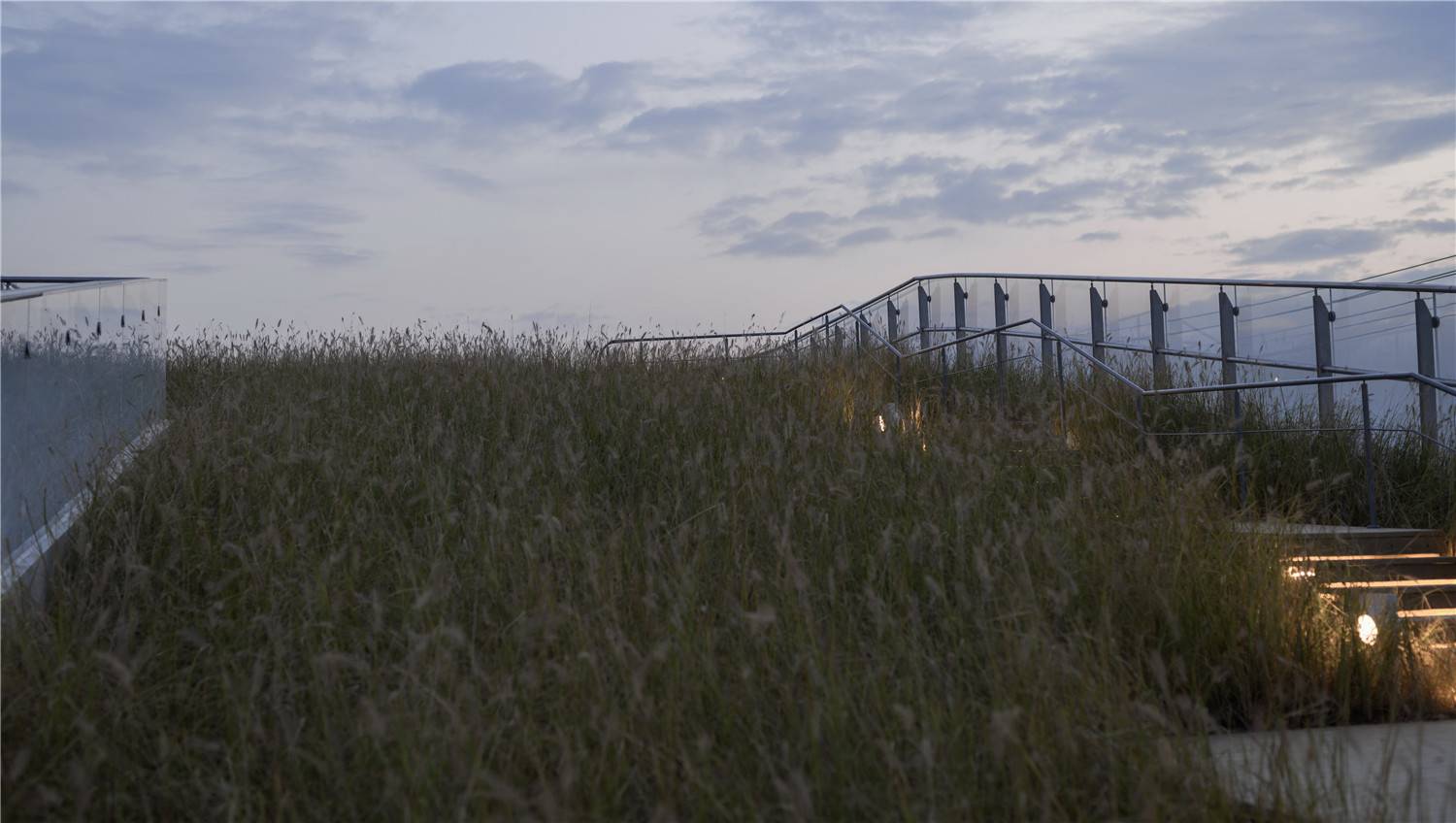On the other side of the terrace, we spread a piece of Pennisetum along the gentle slope of the building. Yellow "wheat field" connects the blue sky, as the sky is touchable by jumping up in the grass slop.