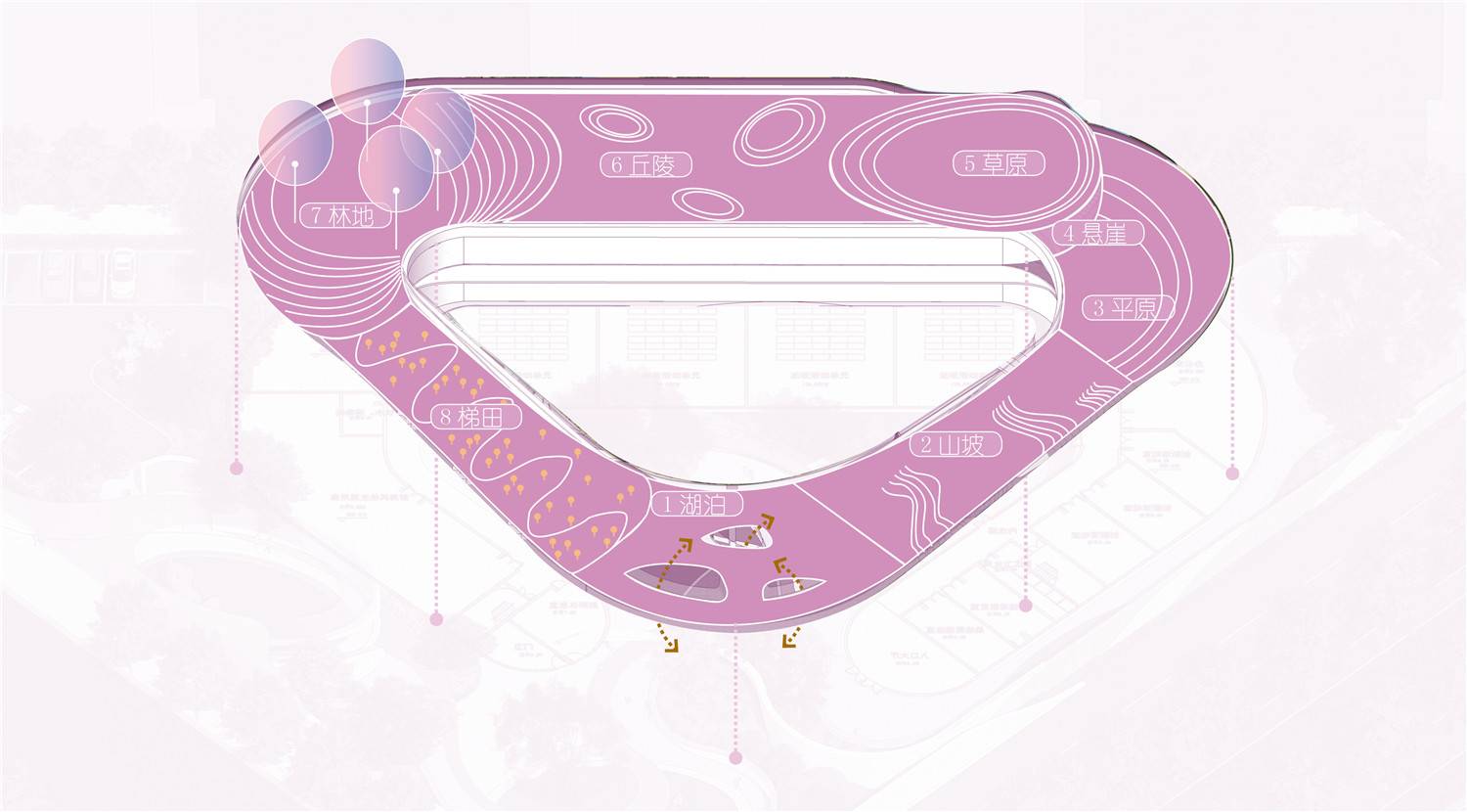 基于場所特性將屋頂模擬成了不同的地貌特征。