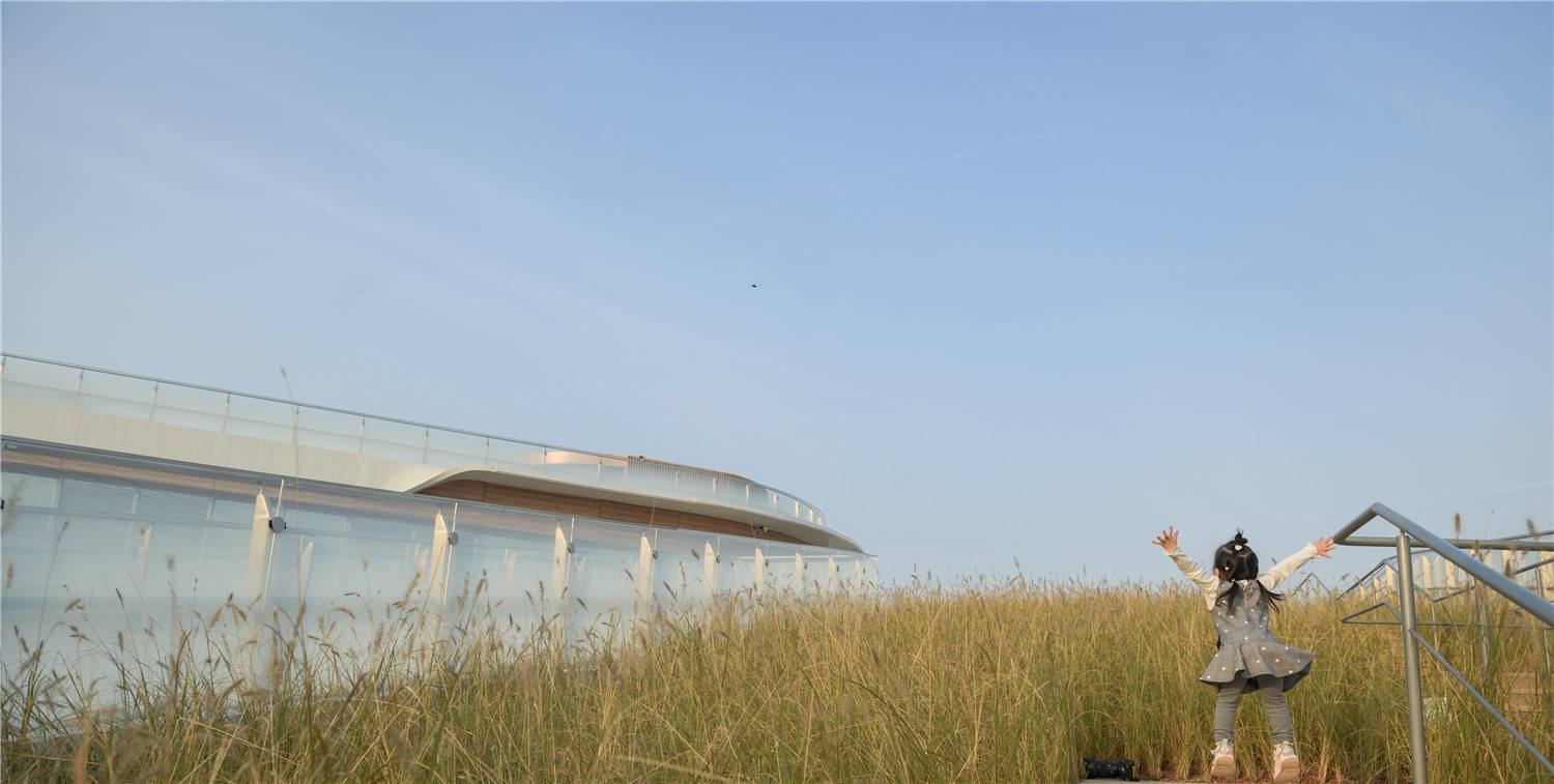 梯田的另一側,我們順著建筑緩坡鋪滿了一片狼尾草,黃色的“麥田”連接著藍色的天空,仿佛在草坡中跳起來就能摸到藍天。