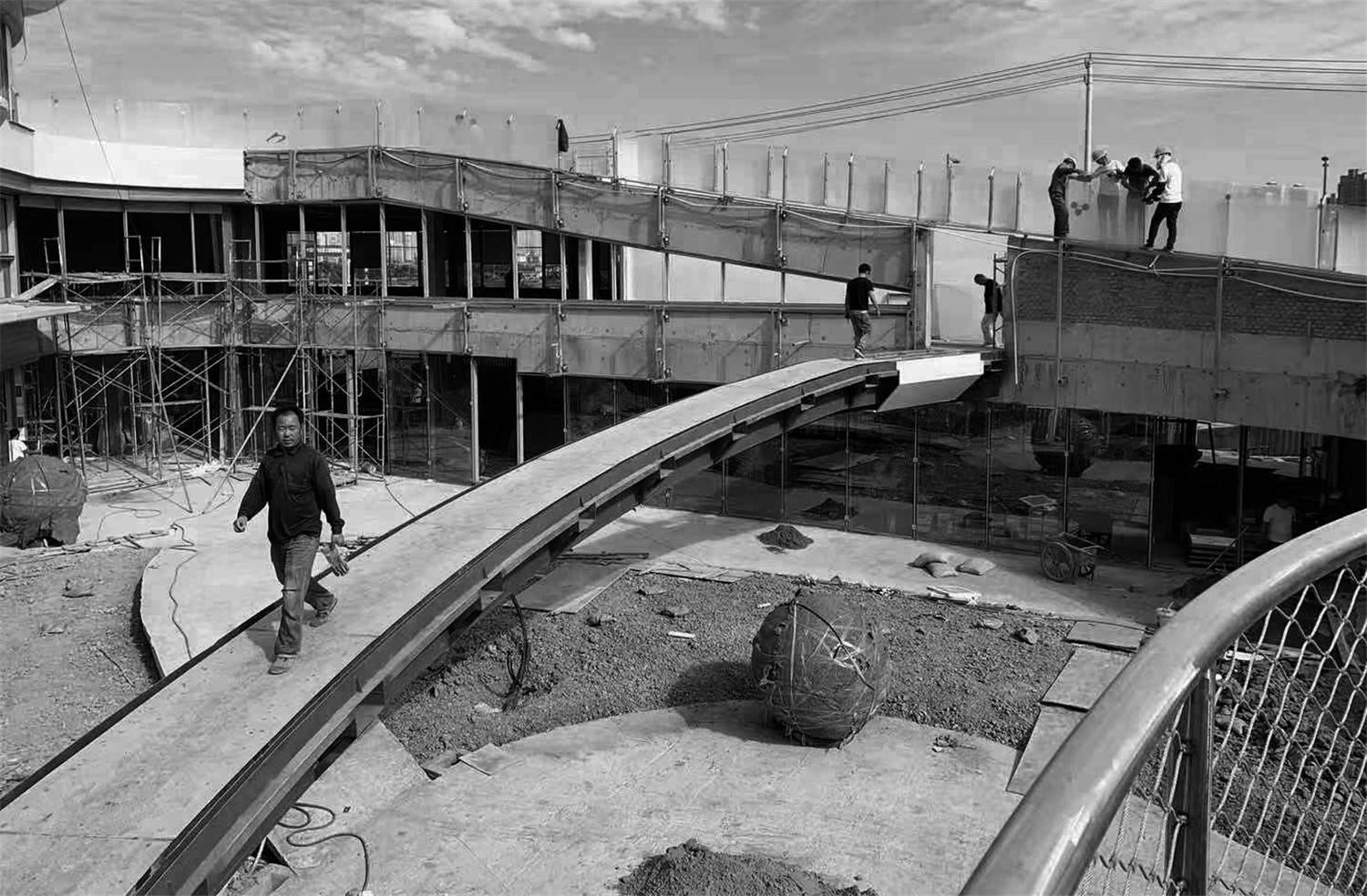 飛廊主體建設完成后因其合理的便利性,使其成為了工地建設過程中的主要人行通道。