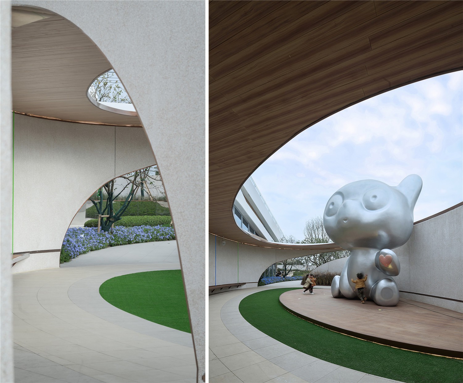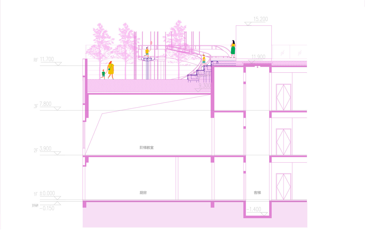 Roof is a more wanton space for children, and in the air, both the senses and the mind will be more comfortable. On the premise of ensuring the activity area of the class, there should be more imaginative and absurd space in the air.