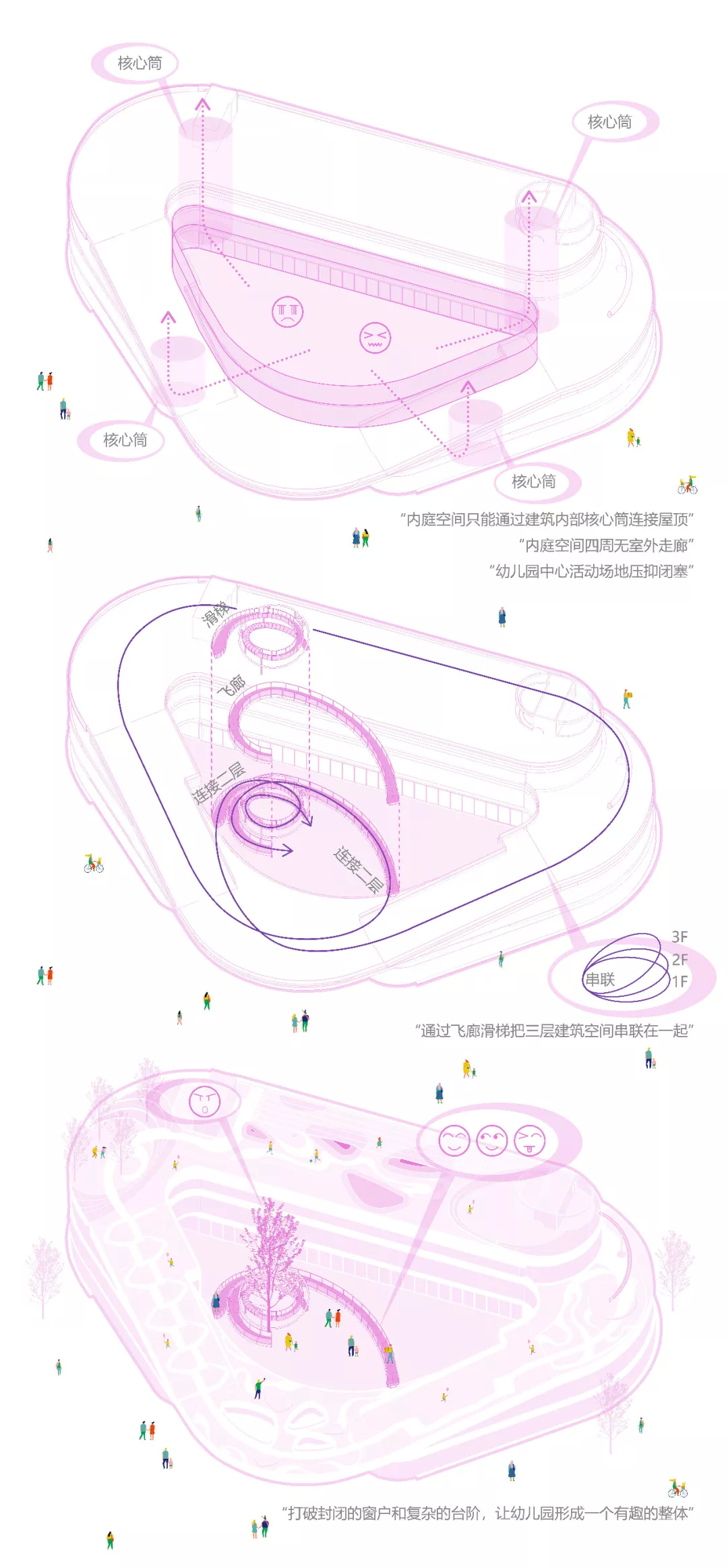 主體空間中,我們希望能有一顆大樹來承載孩子的童年自然感知記憶。孩子們的心靈場所是通過現(xiàn)實世界的經(jīng)驗和想象力一起交織建設的,因此充滿想象力的空間與非凡的體驗更能激發(fā)孩子的想象力,立體的交通布置希望孩子能像麻雀一般在大樹中享受飛翔的快樂。