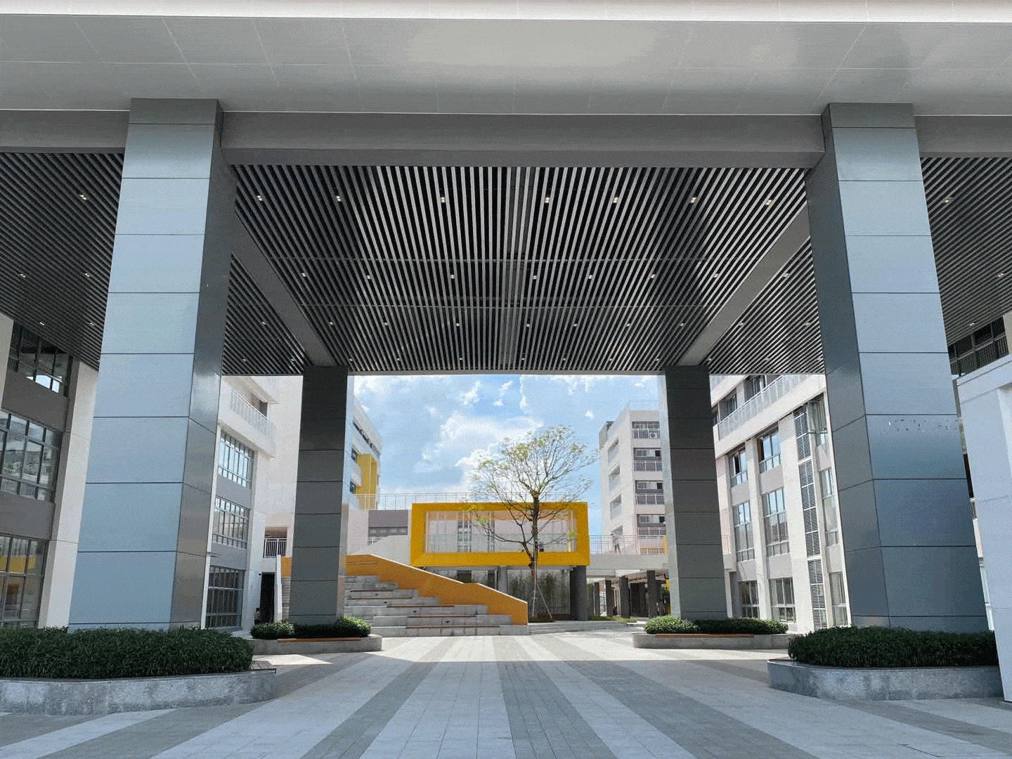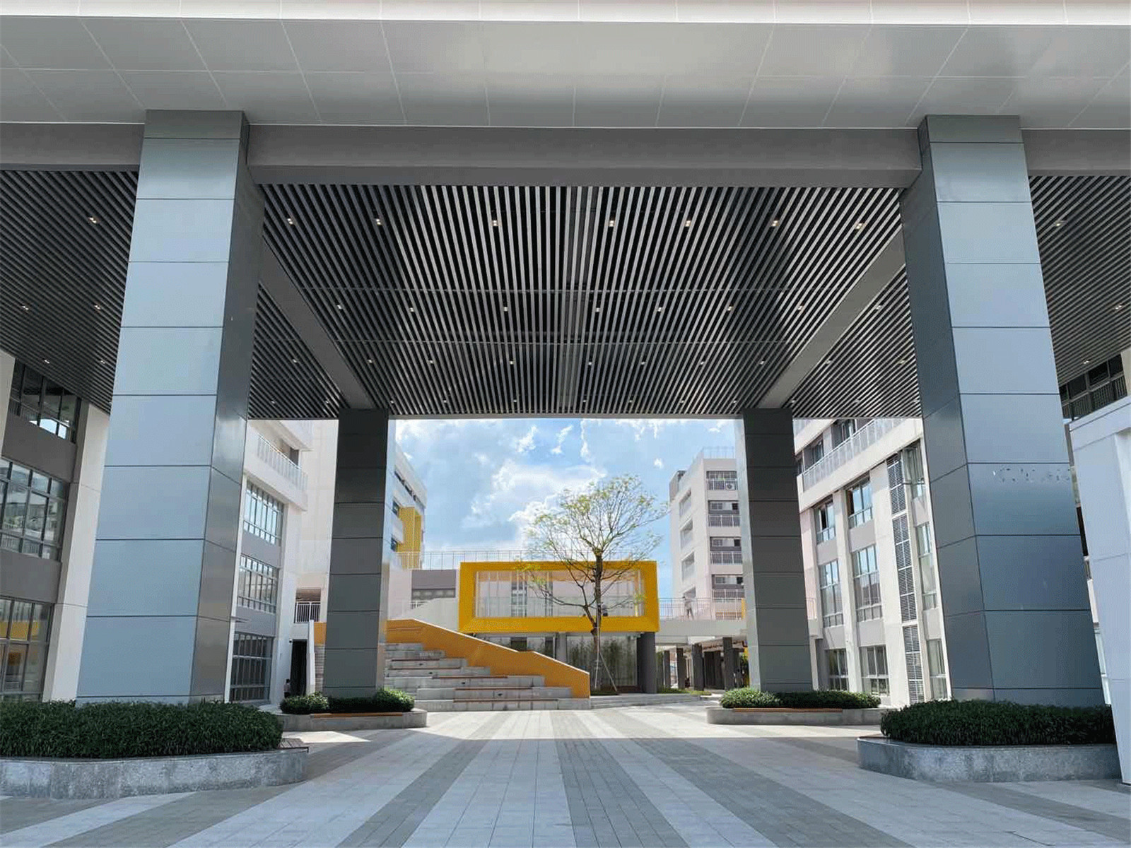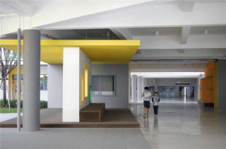 In consideration of display aspect and space interest of project, architectural "yellow box" element is adopted for the design of campus main entrance, coupled with logo wall and honor wall design, the complete fusion of landscape and architecture echoes with urban interface. Leisure benches and boulevard square are set as a buffer space between street and school activities, making the campus interact with the city.