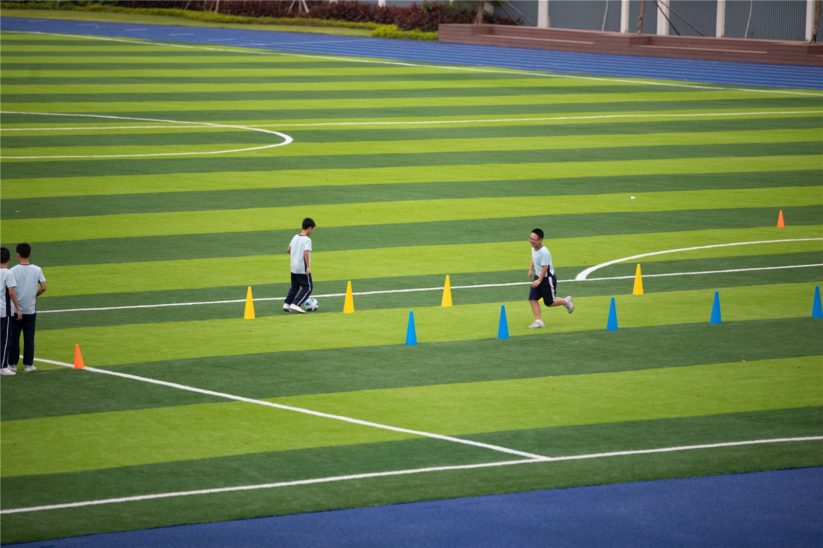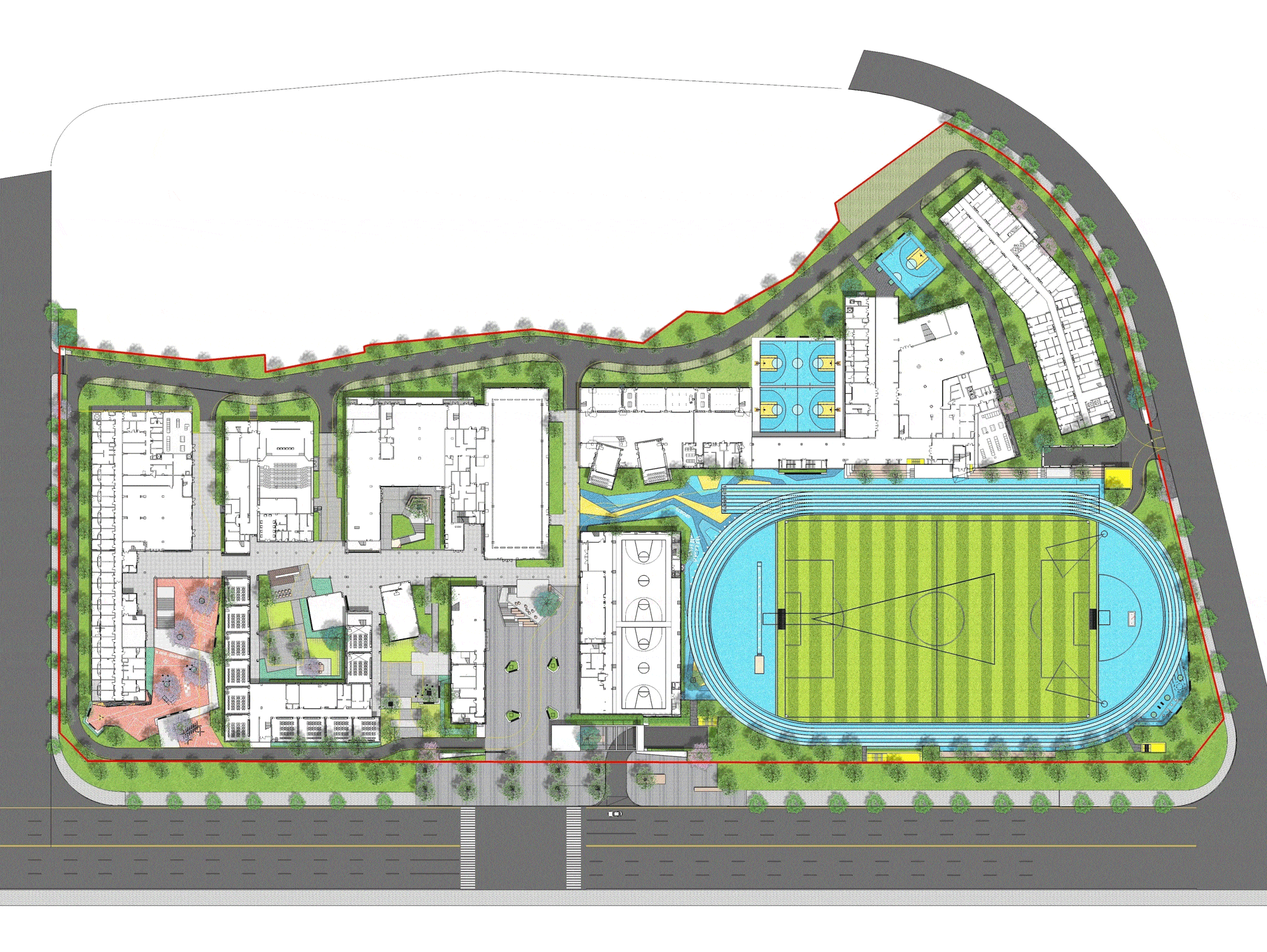 運動場區(qū)從景觀延伸、功能補入、場景再造入手,立足空間設(shè)計的整體性。場地采用新型透水材料,并進行地面安全性能檢測和防滑處理。