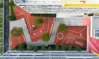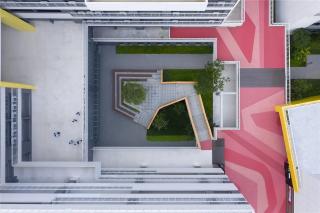 The landscape design of corridor has multiple vertical traffic, which connects the courtyard on the first floor with the platform on the second floor closely. The pattern on corridor extracts the element of polyline style steps, uses red tones representing "enthusiasm" and "vivacity" in large area, which infuses color vitality into school buildings and inspires the nature of children for play.