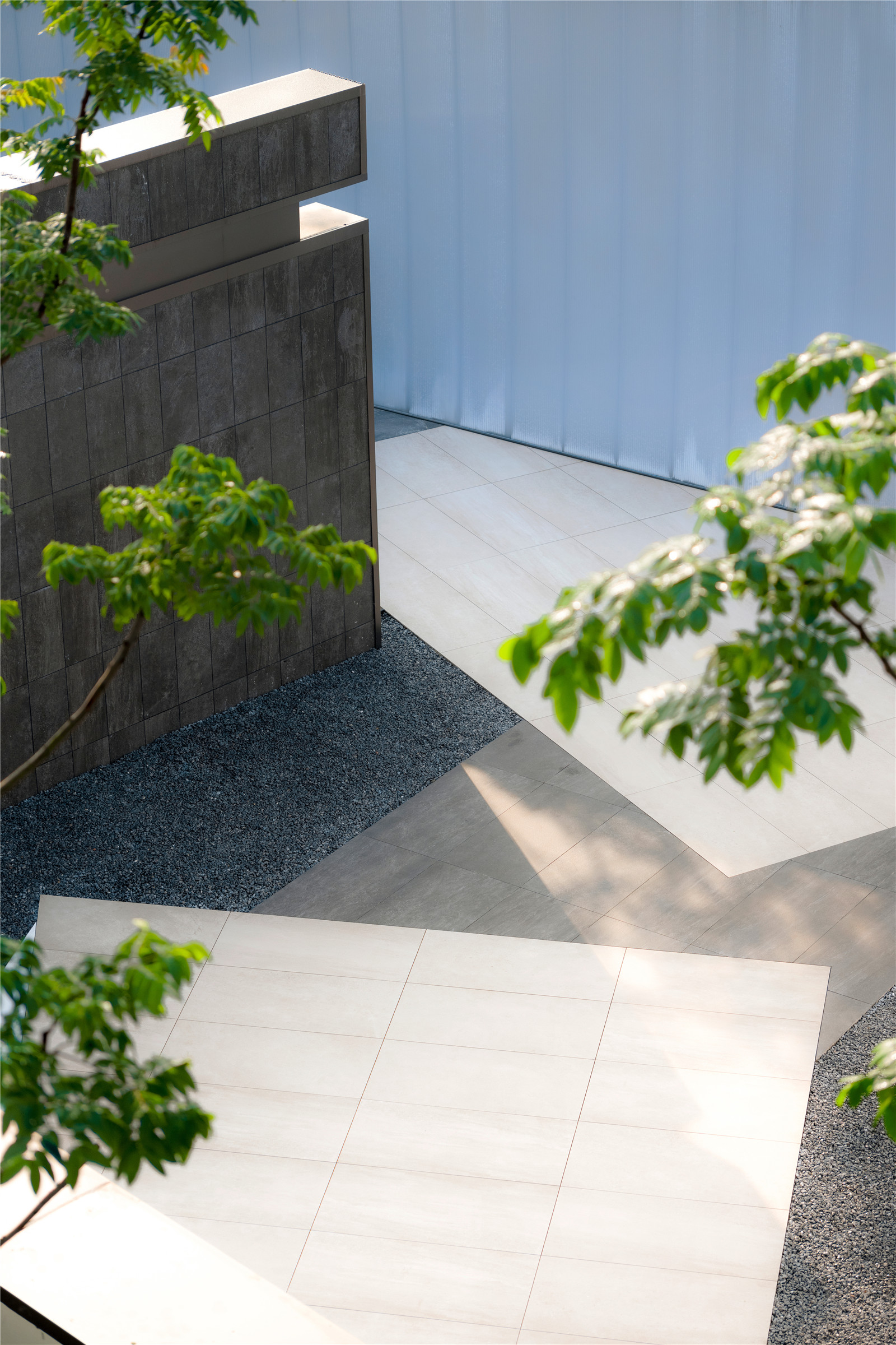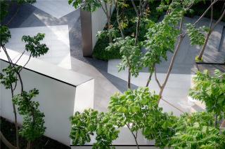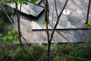 Light is essential for a space. Many koelreuteria paniculatas grow from the terrace and cast shadows on the ground, creating a poetic and mysterious space. Organized in an open style, the space is comfortable for visitors to walk around. Plants cast shades on the wall where dappled sunlight dances elegantly and gracefully. Tangible and intangible light changes in the space, leaving tracks everywhere.