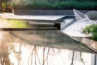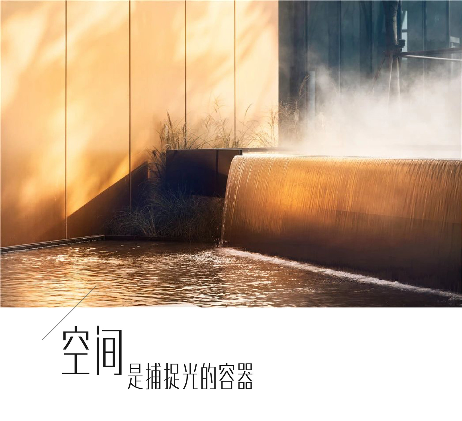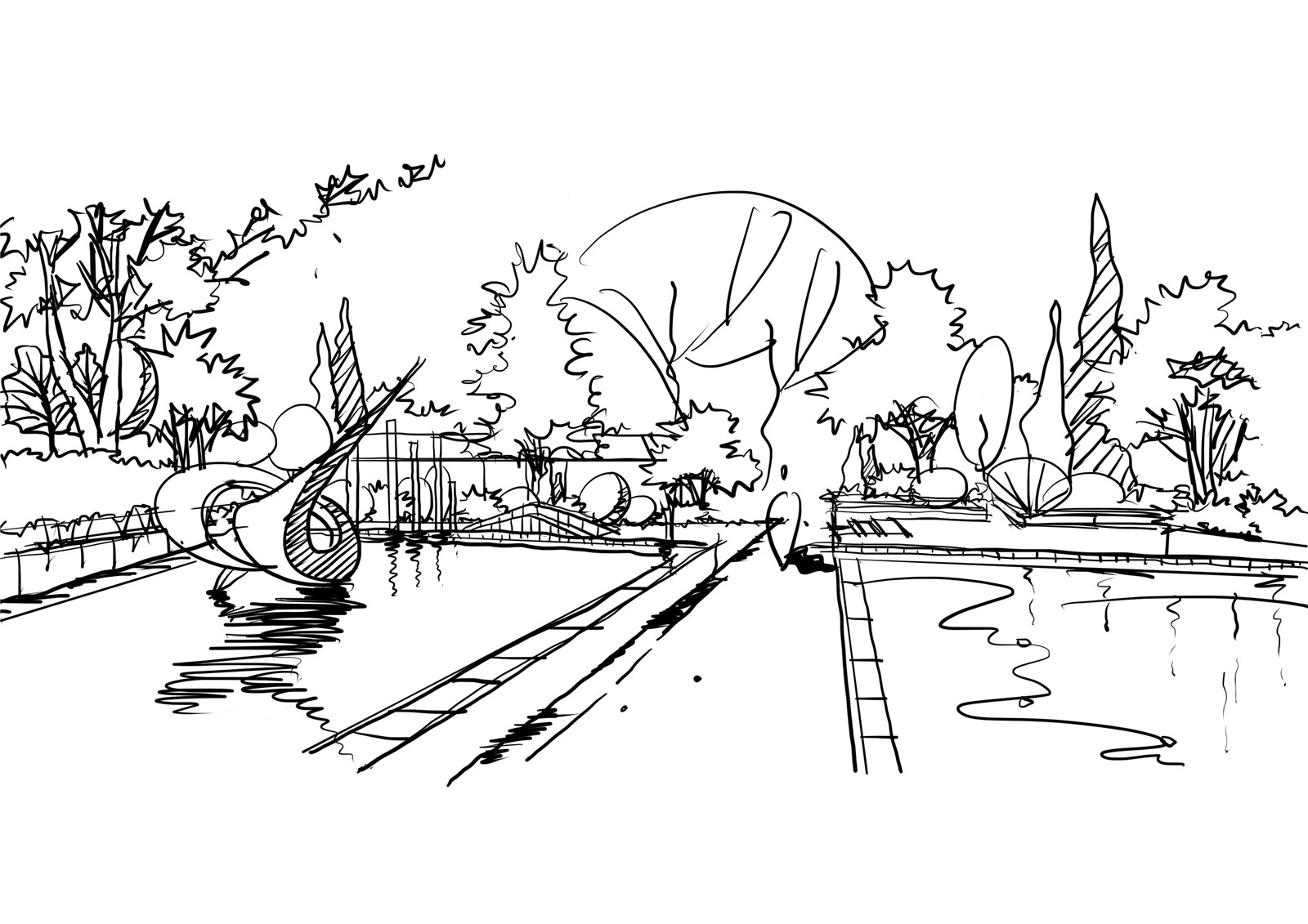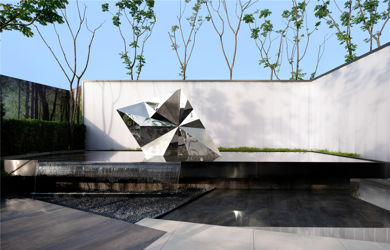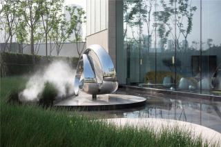 設(shè)計(jì)將室內(nèi)的弧線元素延續(xù)到室外,使室內(nèi)看出去視覺(jué)上達(dá)到景觀與室內(nèi)的和諧統(tǒng)一。鏡水面將水上的雕塑映射出來(lái),池底的設(shè)計(jì)繼續(xù)延續(xù)弧線元素,具有較強(qiáng)的構(gòu)成感。在這樣一個(gè)靜謐的空間,將自己沉浸,讓思緒的觸角延伸。