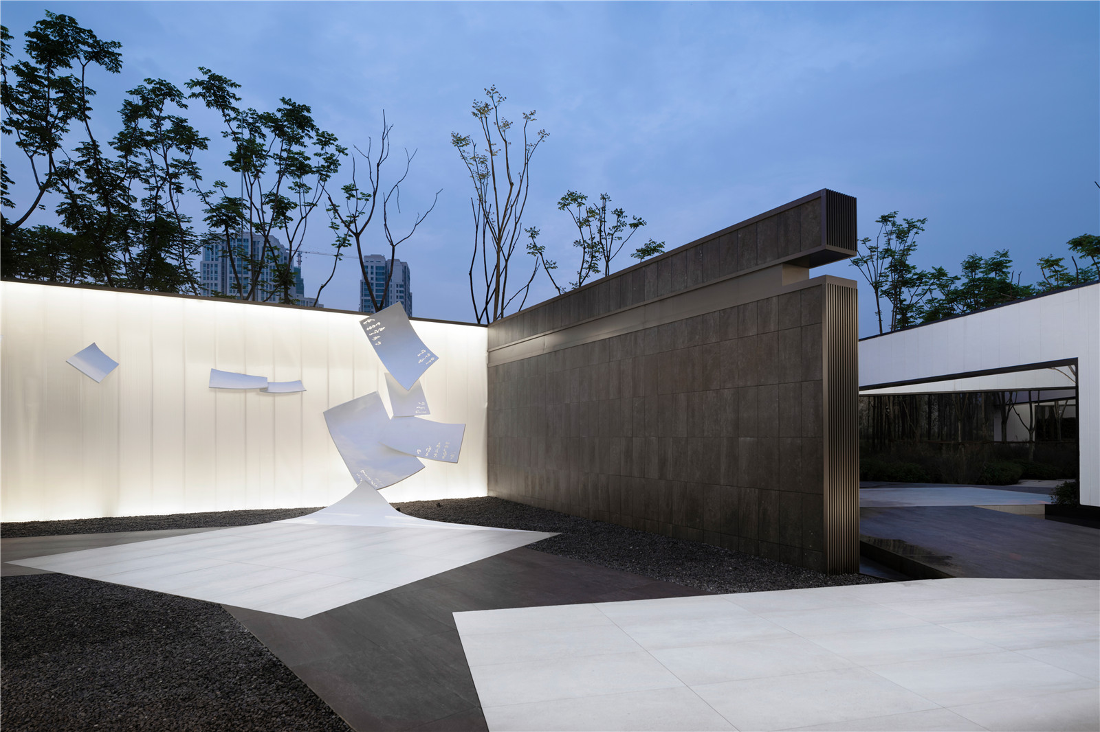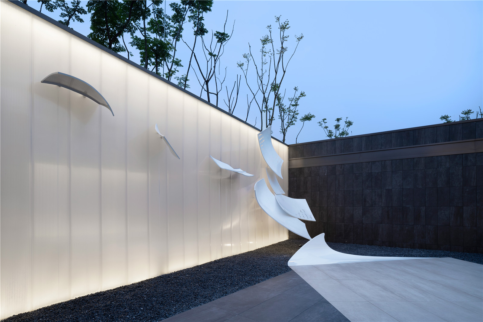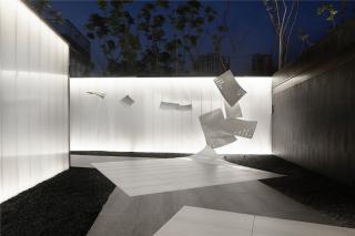 The sculptures of pages highlight the landscape theme, which float down onto the ground to form a mysterious path leading to the garden. The pages activate the space and encourage people to think and walk into another world.