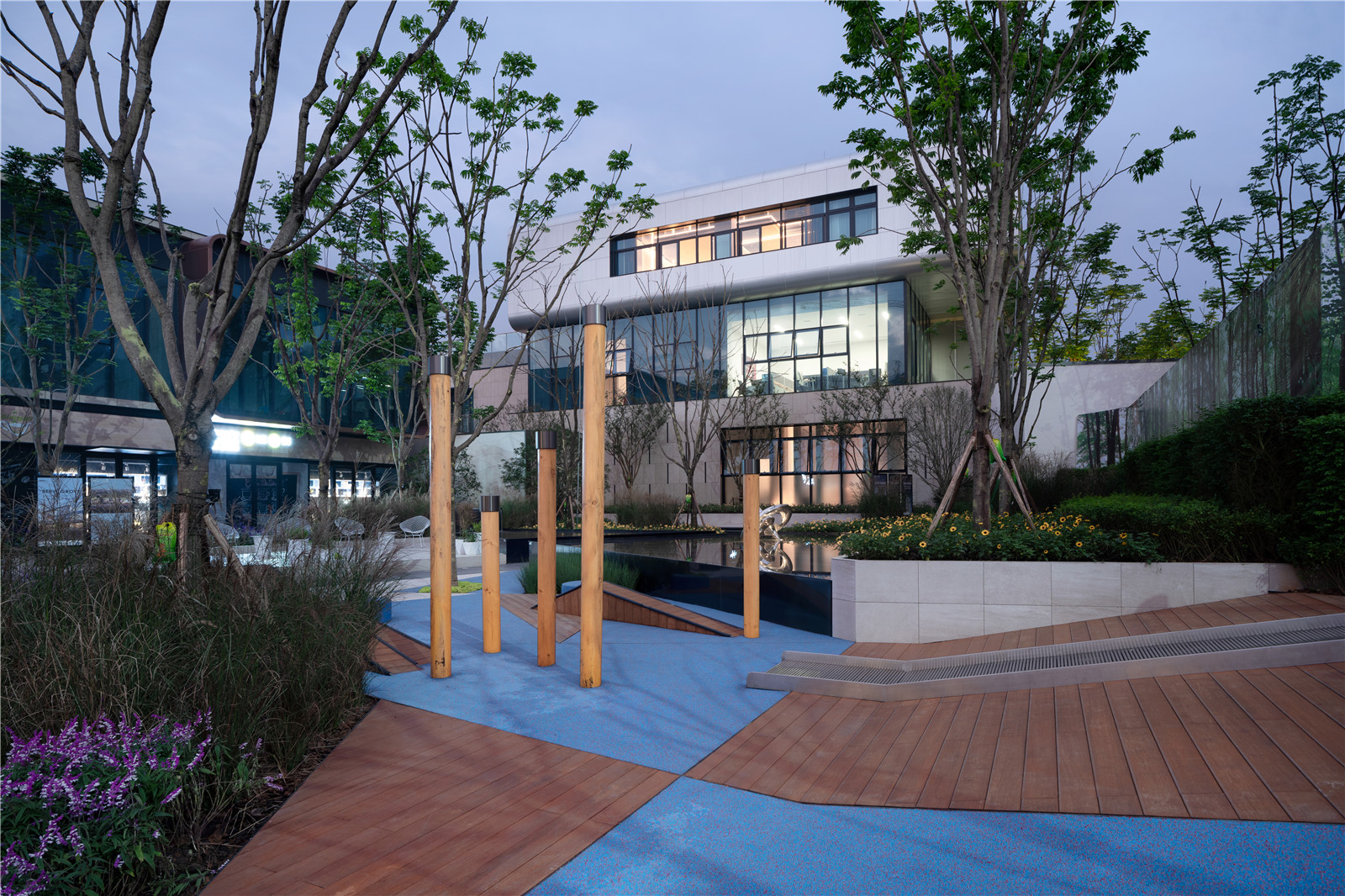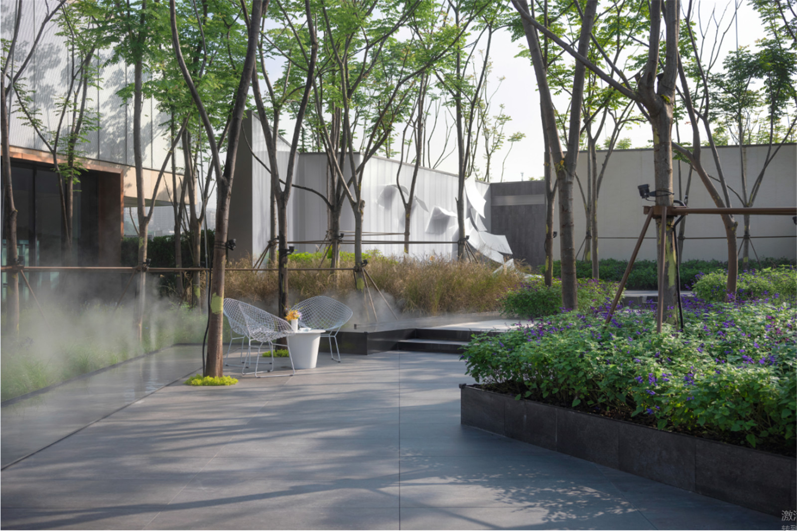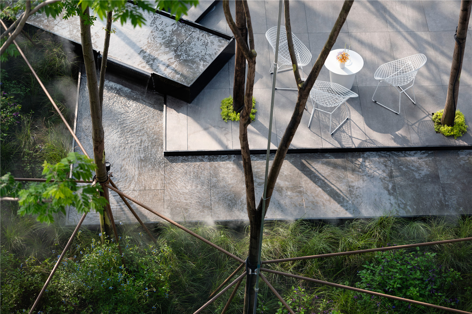 沿路設(shè)置的水景,像林中穿行的小溪,穿插于樹林之中。林下的坐區(qū)散置于場(chǎng)地,人們可以坐在這里愜意的感受空間。