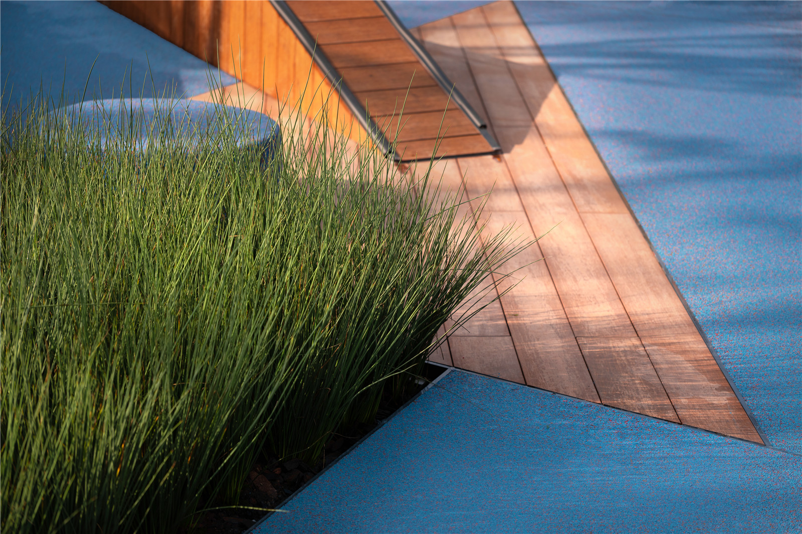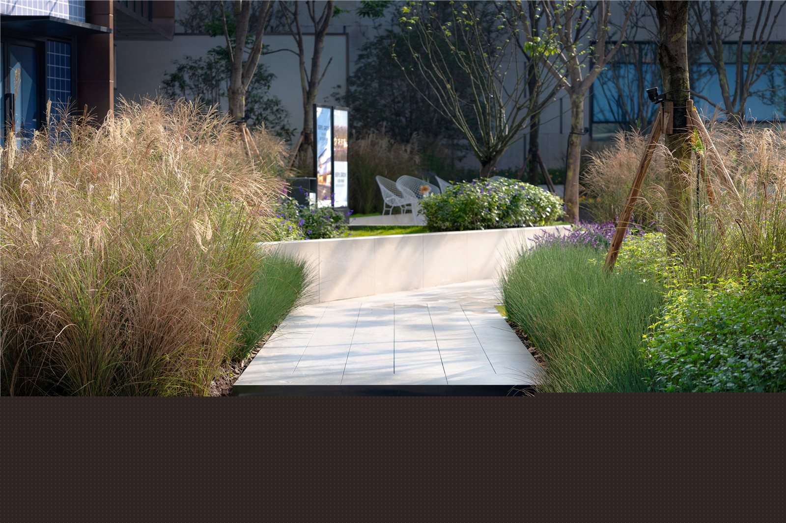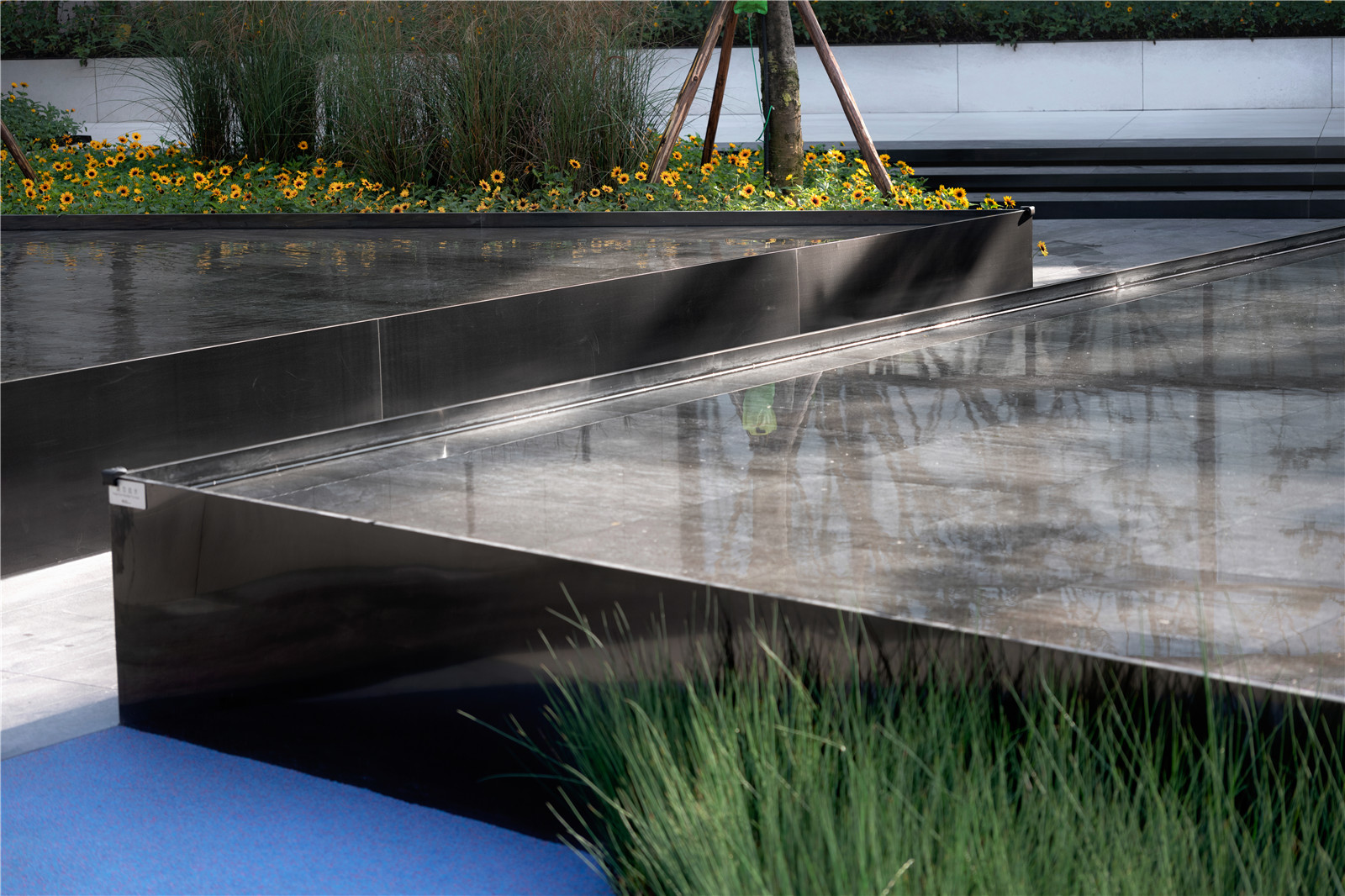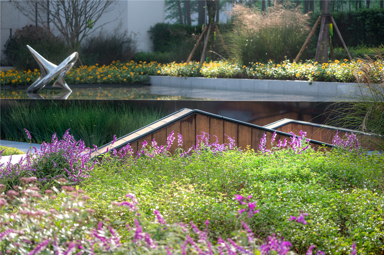 沿路設(shè)置的水景,像林中穿行的小溪,穿插于樹林之中。林下的坐區(qū)散置于場(chǎng)地,人們可以坐在這里愜意的感受空間。