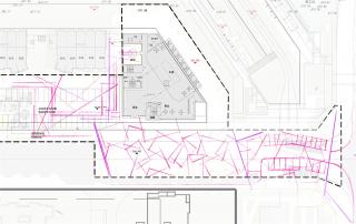 若論空間,自然離不開光線,設(shè)計(jì)采用大量的欒樹從平臺(tái)中生長(zhǎng)出來(lái),形成光影變化豐富的林下空間,讓空間變得隱秘而充滿詩(shī)意。整體空間動(dòng)線采用開放式的布局,可以是人在空間中走動(dòng)時(shí)更為流暢舒適。被植物細(xì)細(xì)切分的光,投射在空間的墻面上,光影感亦不同于空間中庭的專注和立體,凸顯了其秀美的一面。無(wú)形的光與有形的光以不同的方式在空間穿梭,在內(nèi)部留下自己的敘事語(yǔ)言。