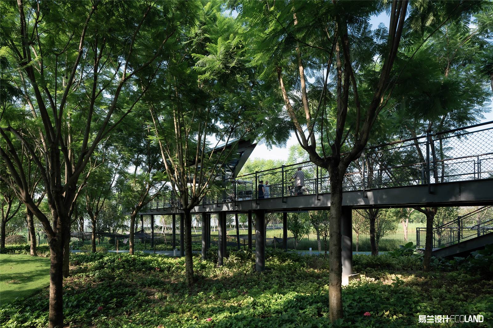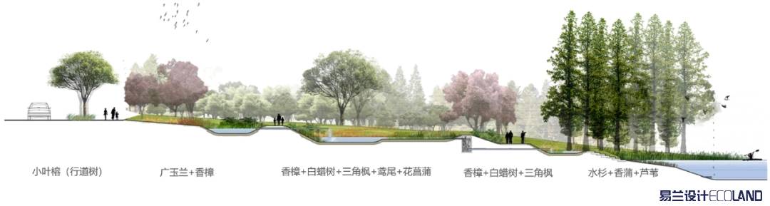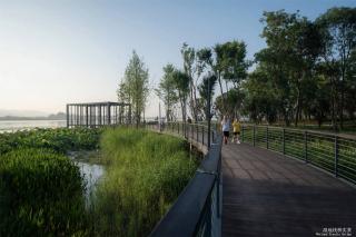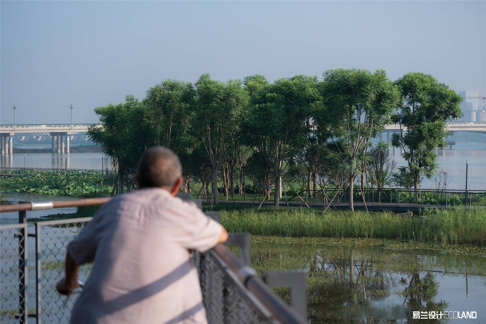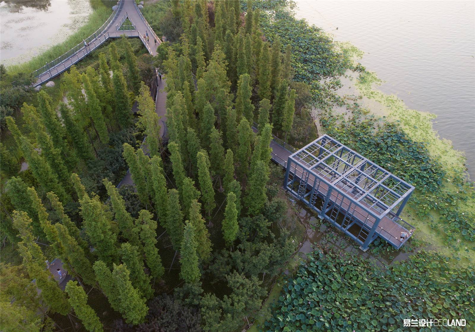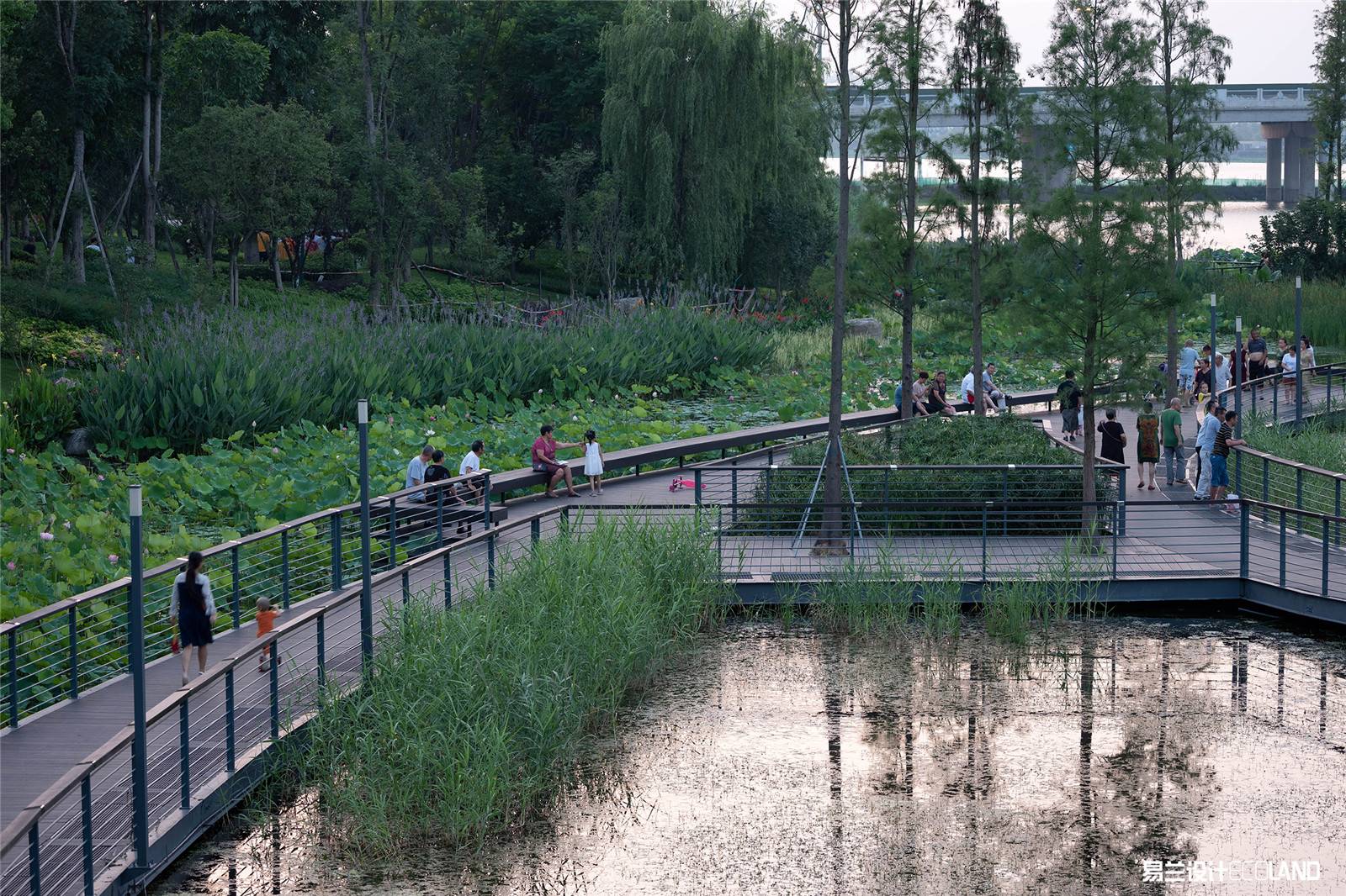 The ecological wetland section uses the original low-lying pit, adjusts the water level, retains the original wetland structure, and realizes a low-cost restoration mode with the least human intervention. The pothole water system is dredged to enhance the flood storage and water transfer function of the river landscape. Dense aquatic plant growth allows fish and birds to comfortably inhabit the wetland park. The foundation of the original corridor and demolition structure in the pit is preserved and utilized, and a wetland recreation trestle road and view gallery frame are built to provide the citizens with pleasant leisure experience. In addition, attention is paid the connection between the trestle system and the surrounding land, the walking road is extended through the surrounding business district and residential area to the wetland trestle system, forming the ring network of the area, which is connected with the bus station and the ferry port of the water traffic node.