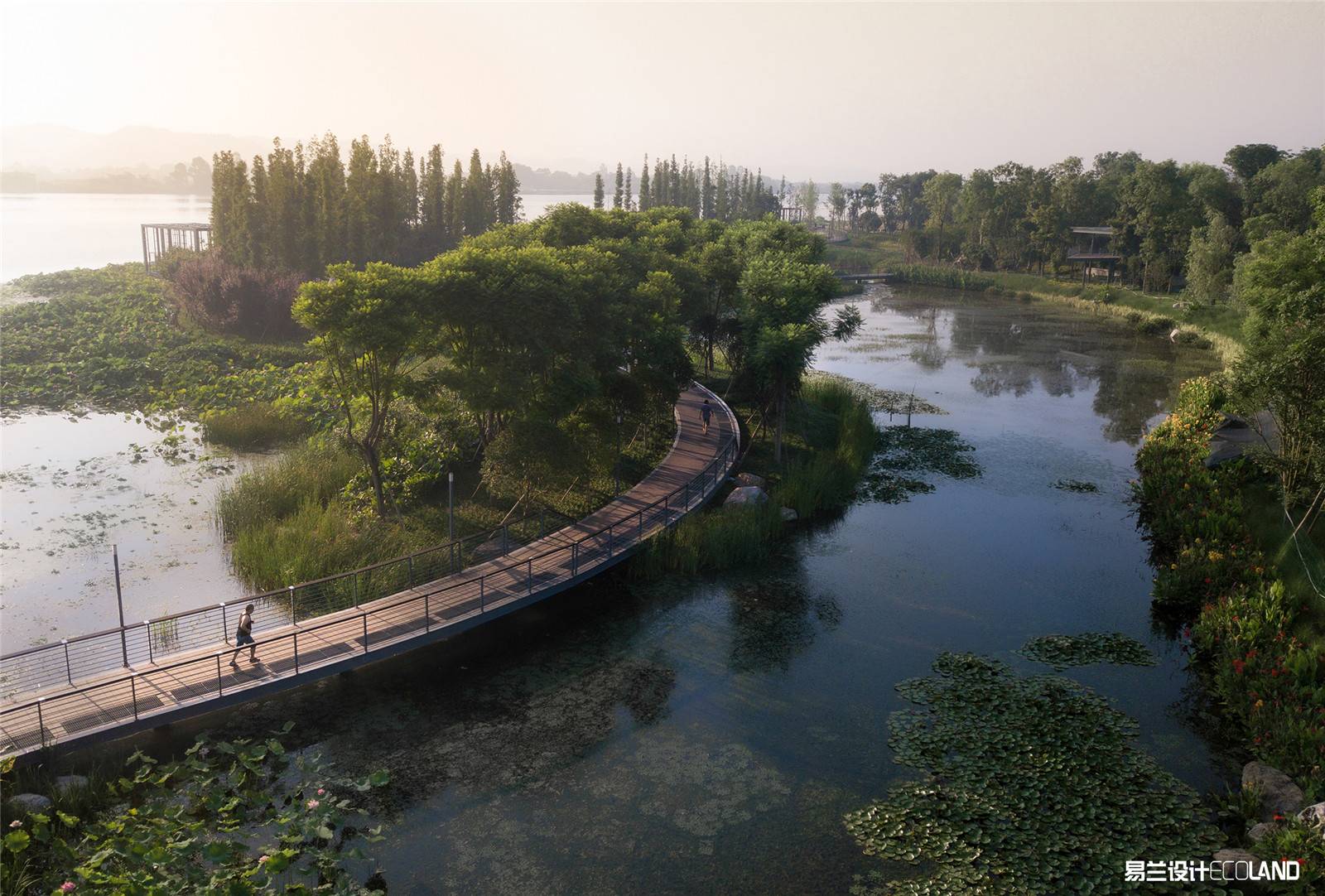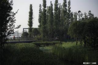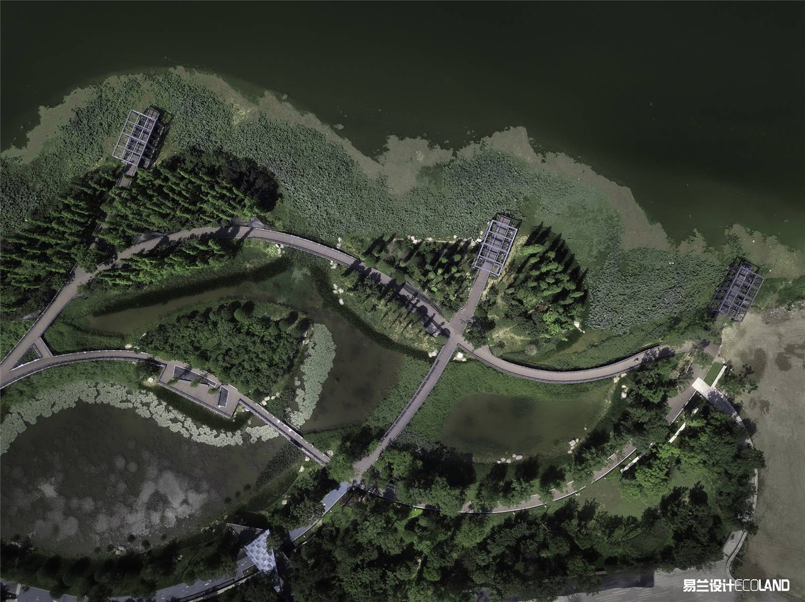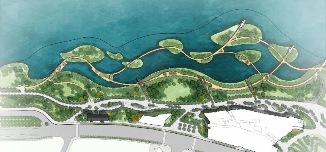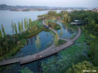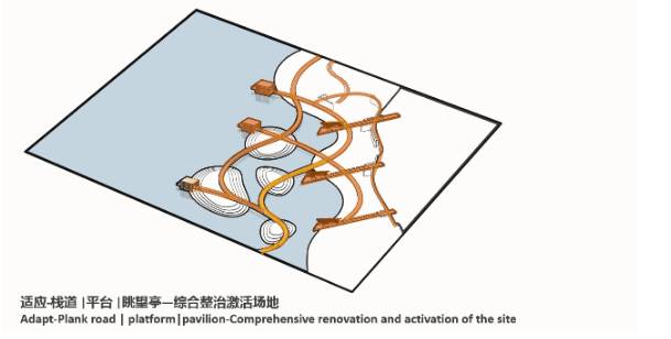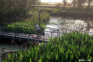 利用了原有的低洼坑塘,調(diào)蓄水位,保留原生濕地結(jié)構(gòu),以最少的人為干預(yù),實現(xiàn)低成本的修復(fù)模式。疏通坑塘水系,增強河流景觀的蓄洪調(diào)水功能。形成水生植物茂密,魚鳥盡歡的濕地公園。休閑設(shè)施根據(jù)不同水位的漲落情況進行合理布局。利用架空棧道及廊架休閑設(shè)施,為人們提供豐富有趣的自然體驗,成為人們放飛自我、接觸自然的好去處。方案保留和利用坑塘中原有廊道及拆遷構(gòu)筑物的基礎(chǔ),修建濕地游憩棧道和觀景廊架,為市民提供怡人的親水休閑體驗。此外,方案十分關(guān)注棧道系統(tǒng)與周邊地塊的聯(lián)系,將周邊商務(wù)區(qū)與居民區(qū)的步行道延伸到濕地棧道系統(tǒng)中,形成該片區(qū)的環(huán)狀慢行網(wǎng)絡(luò),并與公交站點以及水上交通節(jié)點輪渡口接駁。