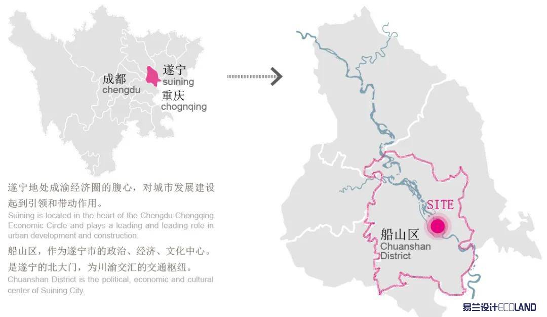 四川省遂寧市,位于四川盆地中部腹心,涪江中游,是成渝經(jīng)濟區(qū)的區(qū)域性中心城市,具有觀音之鄉(xiāng)的美譽,文化底蘊深厚,有良好的濱水景觀資源。遂寧是一座生態(tài)花園城市,擁有優(yōu)越的自然稟賦,市域范圍內(nèi)坐落著濕地生態(tài)公園、國家地質(zhì)公園、文化古鎮(zhèn)。遂寧地處成渝經(jīng)濟圈的腹心,人口、經(jīng)濟和產(chǎn)業(yè)不斷發(fā)展,對四川發(fā)展起到引領(lǐng)和帶動作用。市政府希望通過濱江南路景觀帶的打造,為遂寧增加一個美麗的城市名片,為市民增加一處喜聞樂見的濱水休閑場所。