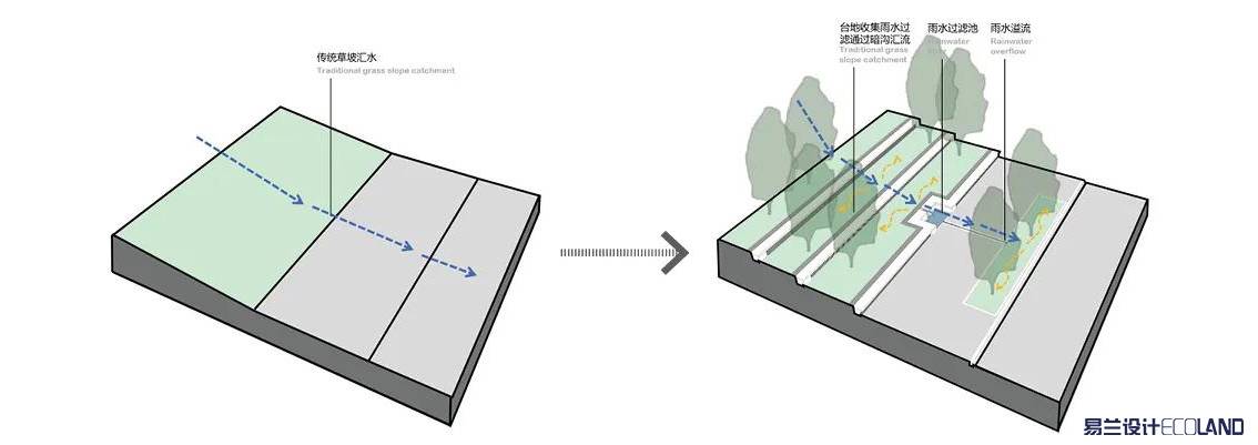 方案盡量保留場地上原有的樹木和可利用的鋪裝,減少浪費,摒棄高投入的建造模式。方案秉持低影響開發(fā)的理念,在沿城市界面的河堤反坡上,因勢利導(dǎo)地利用原有地形塑造富于觀賞性的臺地花園。梯臺景觀與路徑上的臺階精致地組合一體令人耳目一新,依坡就勢保留場地上的植物群落,合理地組織地表雨水,層層澆灌,沿途利用疊落水口造景并通過在人行道鋪裝上設(shè)計精巧的細溝,把過剩的雨水最終導(dǎo)流進入街邊綠化帶中。這個設(shè)計把整個步行街組織成為一個雨水管理的展示花園,收集和利用降水徑流,把自然生態(tài)的理念與精致的設(shè)計細節(jié)有機結(jié)合為一體。