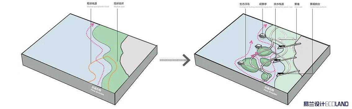 該段濕地現(xiàn)狀有1100米棧道,且因防洪需求不能放置過多構(gòu)筑物。方案重新梳理現(xiàn)狀,在保留原有濕地浮島結(jié)構(gòu)、原有650米棧道基礎(chǔ)的前提下,增加棧道平臺、眺望亭綜合整治激活場地。