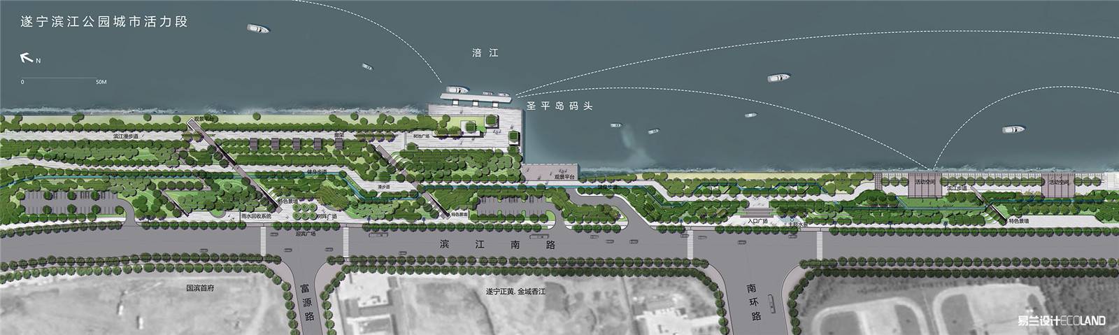 遂寧南濱江公園項目面積約130萬平方米,景觀帶全長約9公里,沿涪江分為三部分。公園的打造是基于其中城市活力段的規(guī)劃進行設(shè)計的。易蘭的方案根據(jù)不同人群的活動需求,為市民提供了一個高參與性的濱江綠帶公園。