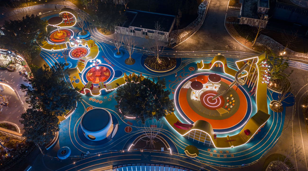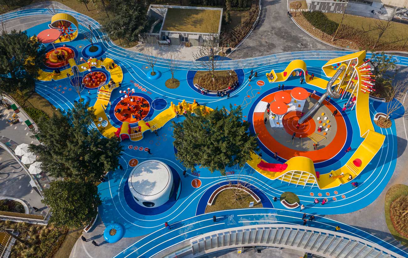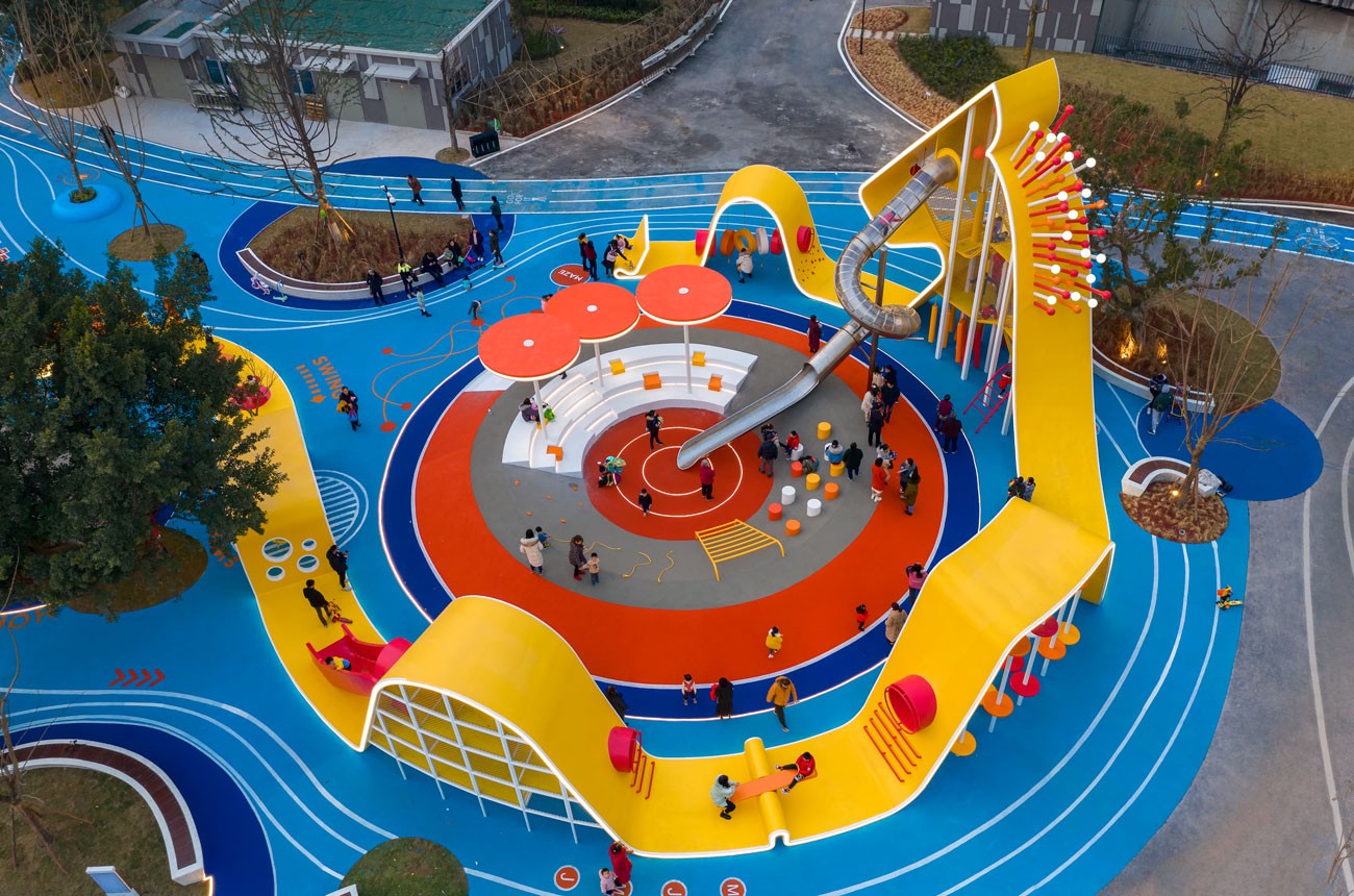 這匹神秘的飛馬在身后留下了神奇的黃色蹤跡,完美地蜿蜒在圓形迷你廣場周圍,形成休閑和社交的平臺,將游樂場景觀變成了一個多功能的公共空間,供兒童和成人享用。