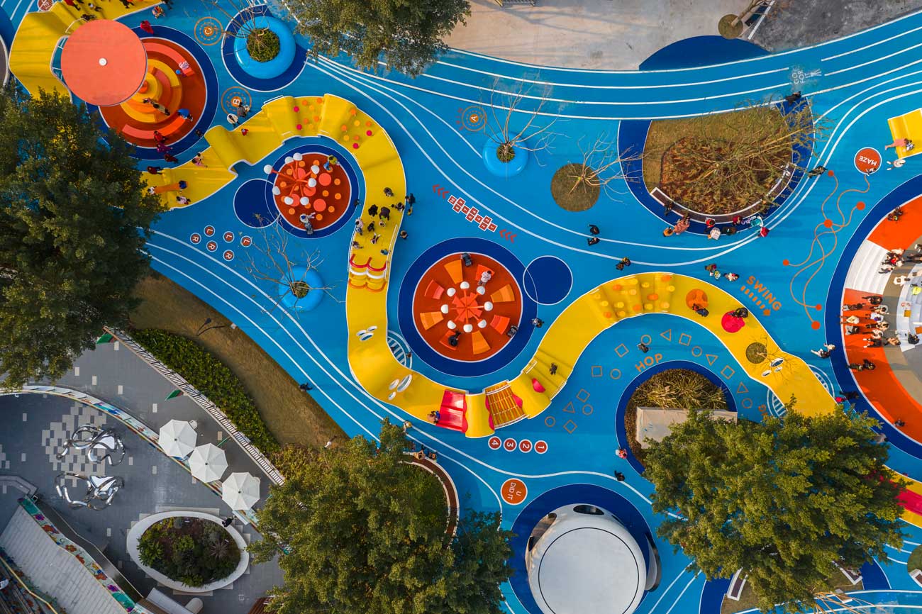 The mythical winged horse leaves a magical yellow trace behind, meandering accurately around circular mini-plazas that serve as platforms for leisure and social interactions, turning the playscape into a multifunctional public space to be enjoyed by kids & adults alike.