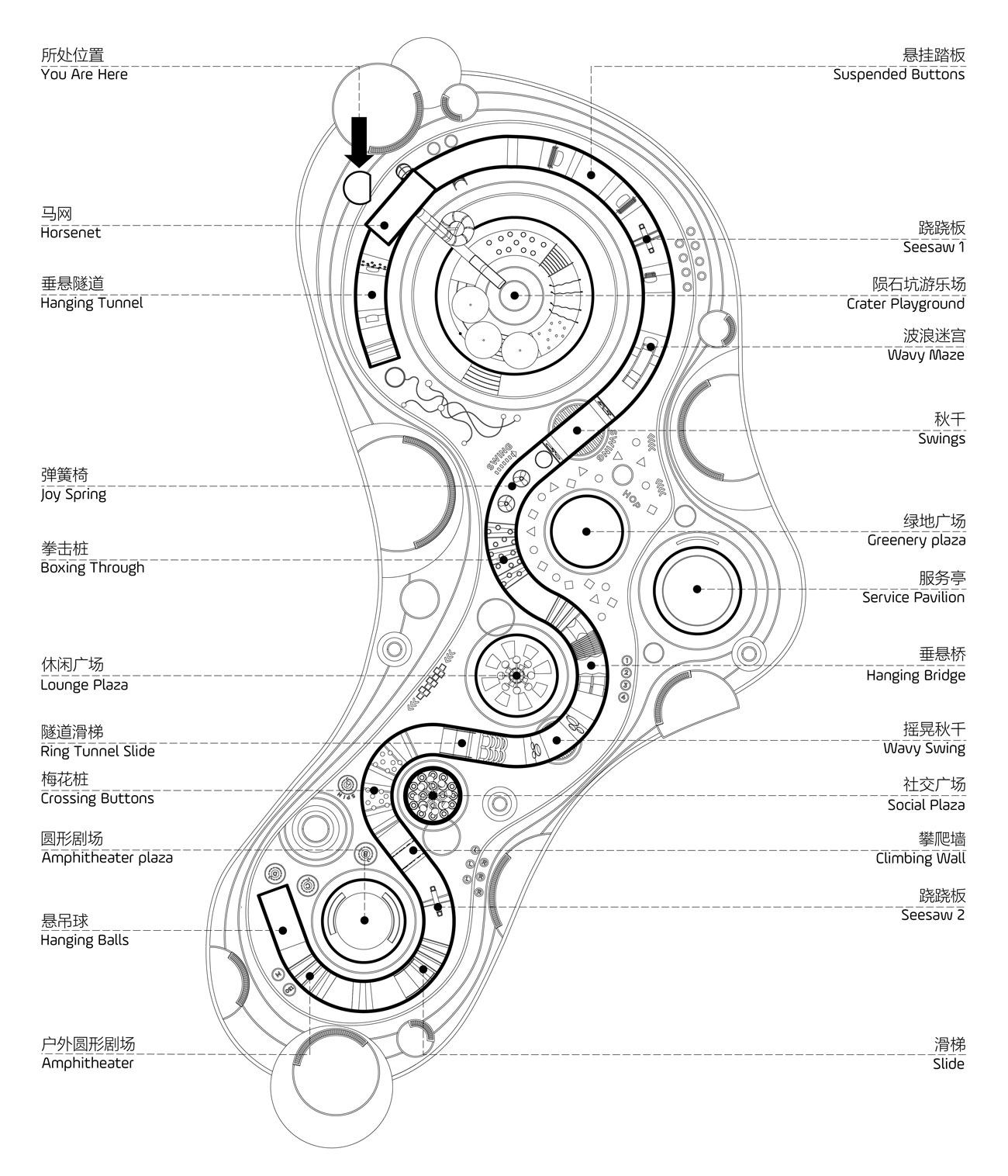 絲帶蜿蜒在3個圓形迷你廣場周圍,廣場上擺放著不同類型的城市家具供人們休息。緞帶代表了供孩子們及體驗者的游玩和活動的區(qū)域,而圓形廣場則代表了供父母和成年人休息和安靜的區(qū)域。