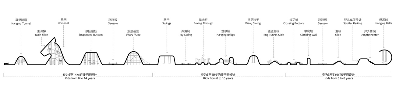因此,針對不同年齡段的兒童,游玩線路被分為復雜性不一的不同部分。針對3到6歲的孩子,我們在馬尾處設計了相對容易的的游戲組件,而越靠近馬頭的部分,復雜度隨之逐漸增加,對于6到14歲的孩子來說是一個更大的挑戰(zhàn)。