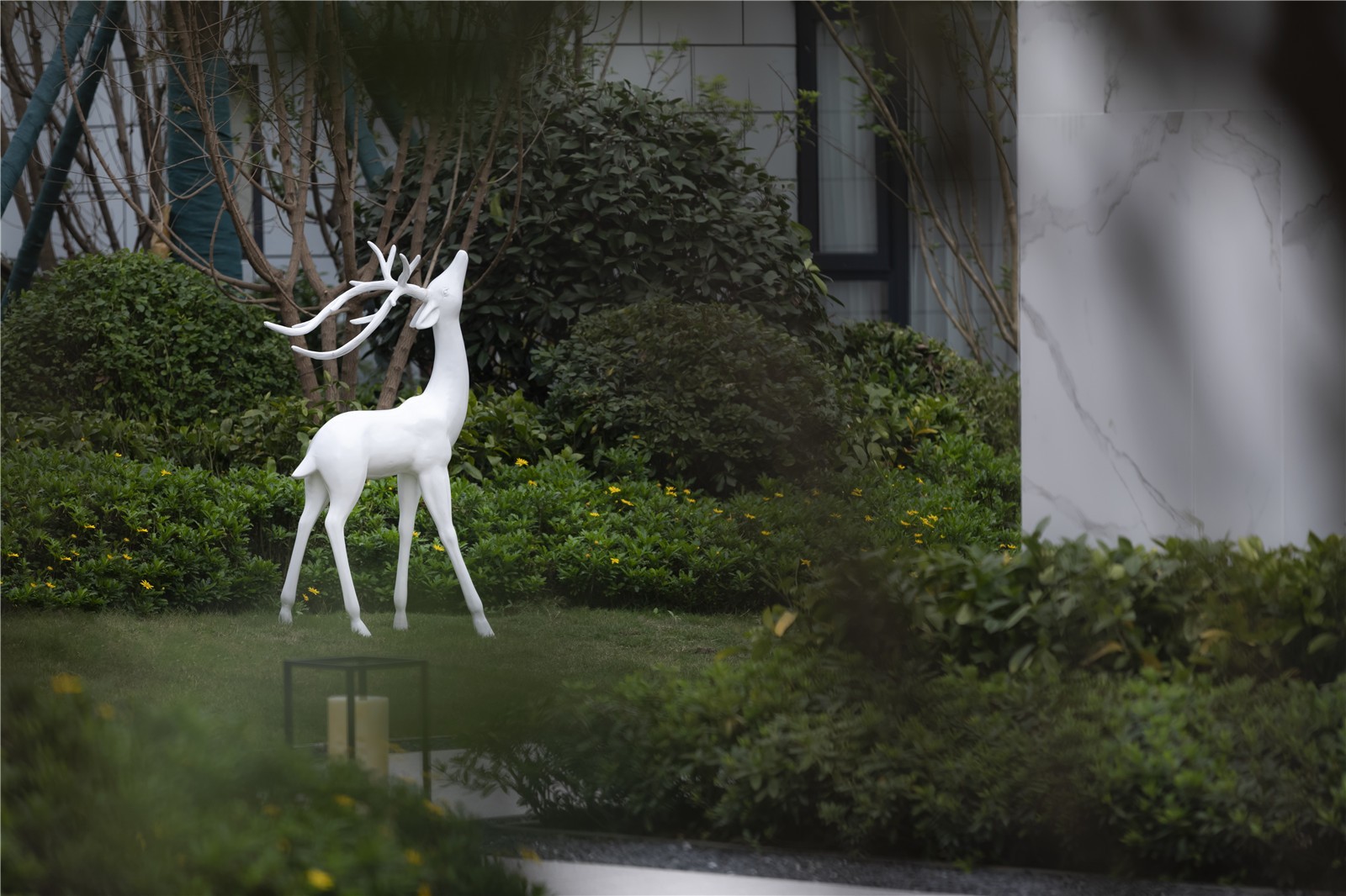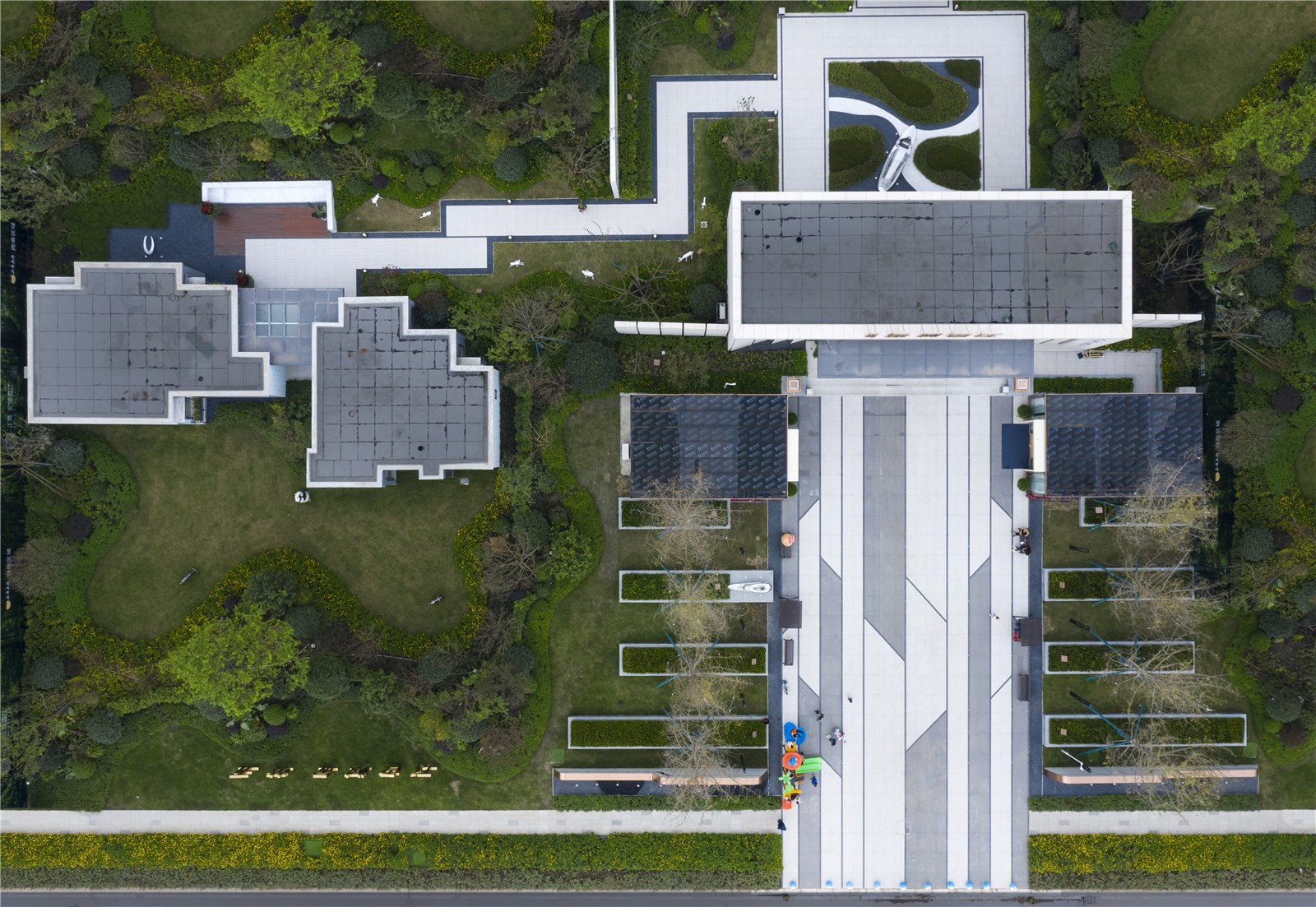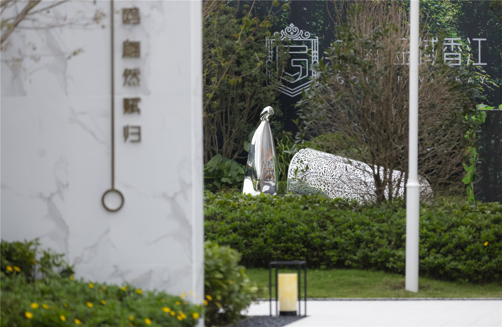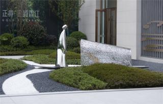 設(shè)計(jì)上盡可能少的設(shè)計(jì)水景,減少大區(qū)后期維護(hù)。利用庭院景觀、對(duì)景景墻多重空間體驗(yàn),以及條形灌木與錯(cuò)落樹陣結(jié)合,塑造禮賓軸線。核心景觀“水韻淺洲”裝置藝術(shù),點(diǎn)睛產(chǎn)品系“香江”文化。
