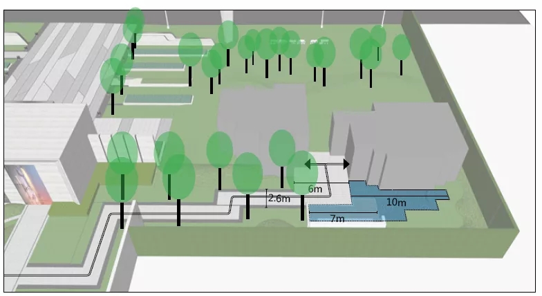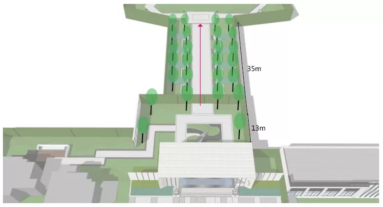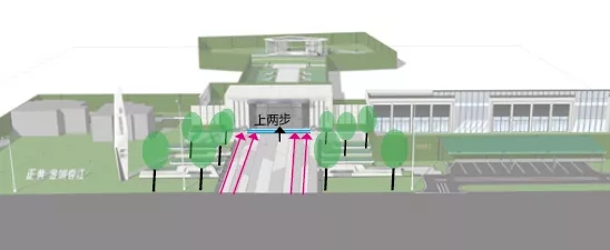 前場(chǎng)盡量保證門樓完整的視覺沖擊力, 設(shè)計(jì)迎賓矮墻與藝術(shù)雕塑營(yíng)造儀式感,喬木列于兩側(cè)保證門樓完整性。線性鋪裝設(shè)計(jì)引導(dǎo)指向性, 精神堡壘突出地面,引導(dǎo)強(qiáng)調(diào)作用。入口門庭設(shè)計(jì)臺(tái)階,增添大門氣勢(shì)的同時(shí)解決部分高差。