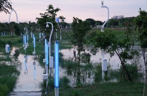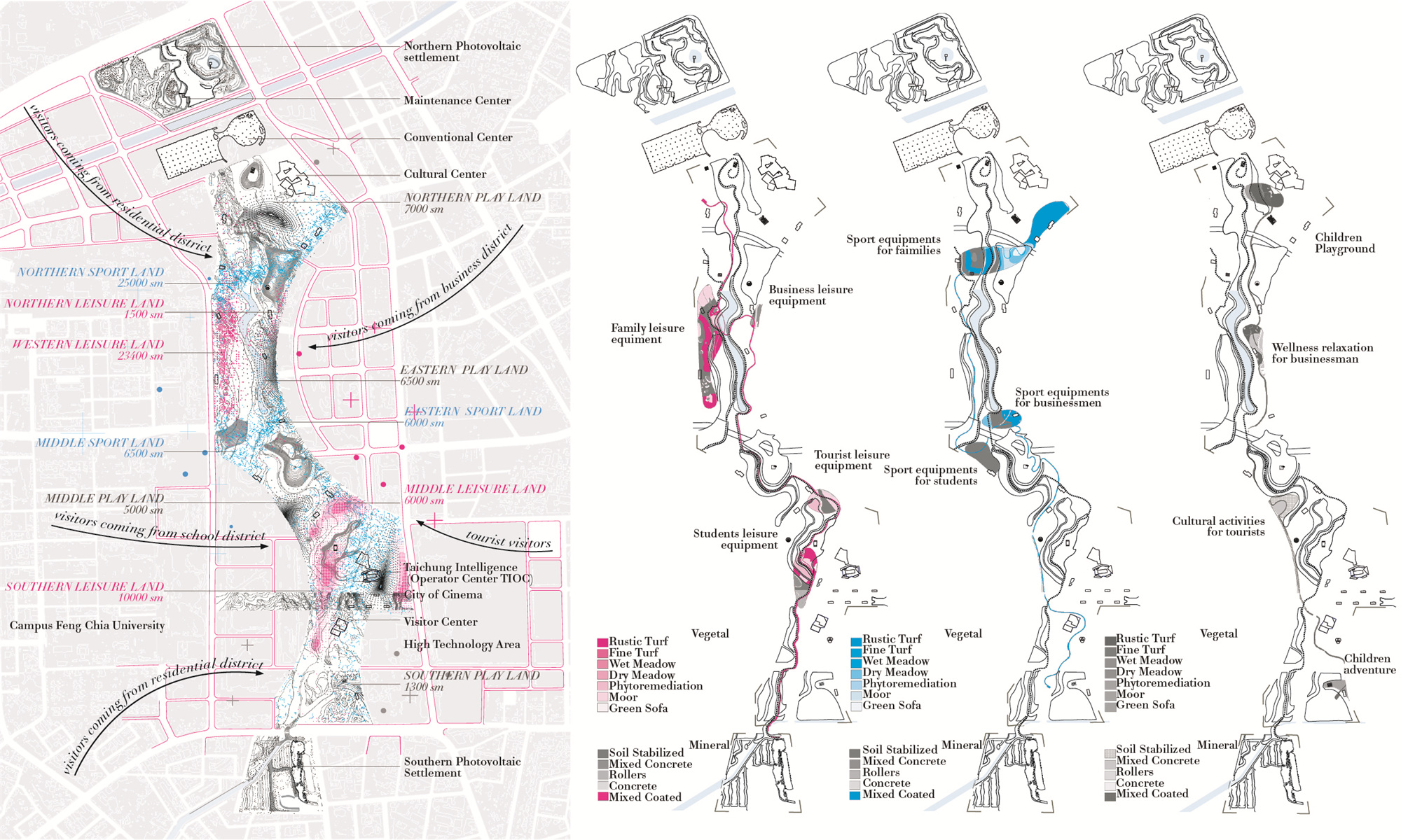 The park acts as a moderator: it proposes a variety of beaches, of gardens, of places and offer to the people of Taichung sensual experiences, partly based on the principle of senses of Rudolf Steiner, with twelve Fields -Speech, Taste, Hearing, Equilibrium, Thinking, Vision, Movement, Ego, Touch, Warmth, Smell, Life- providing visitors with places of gaming, meeting or just walk around powerful landscapes.