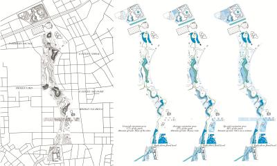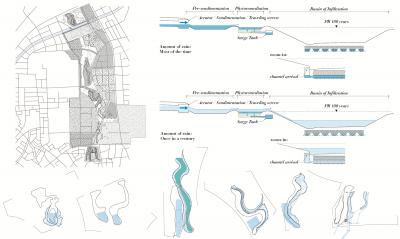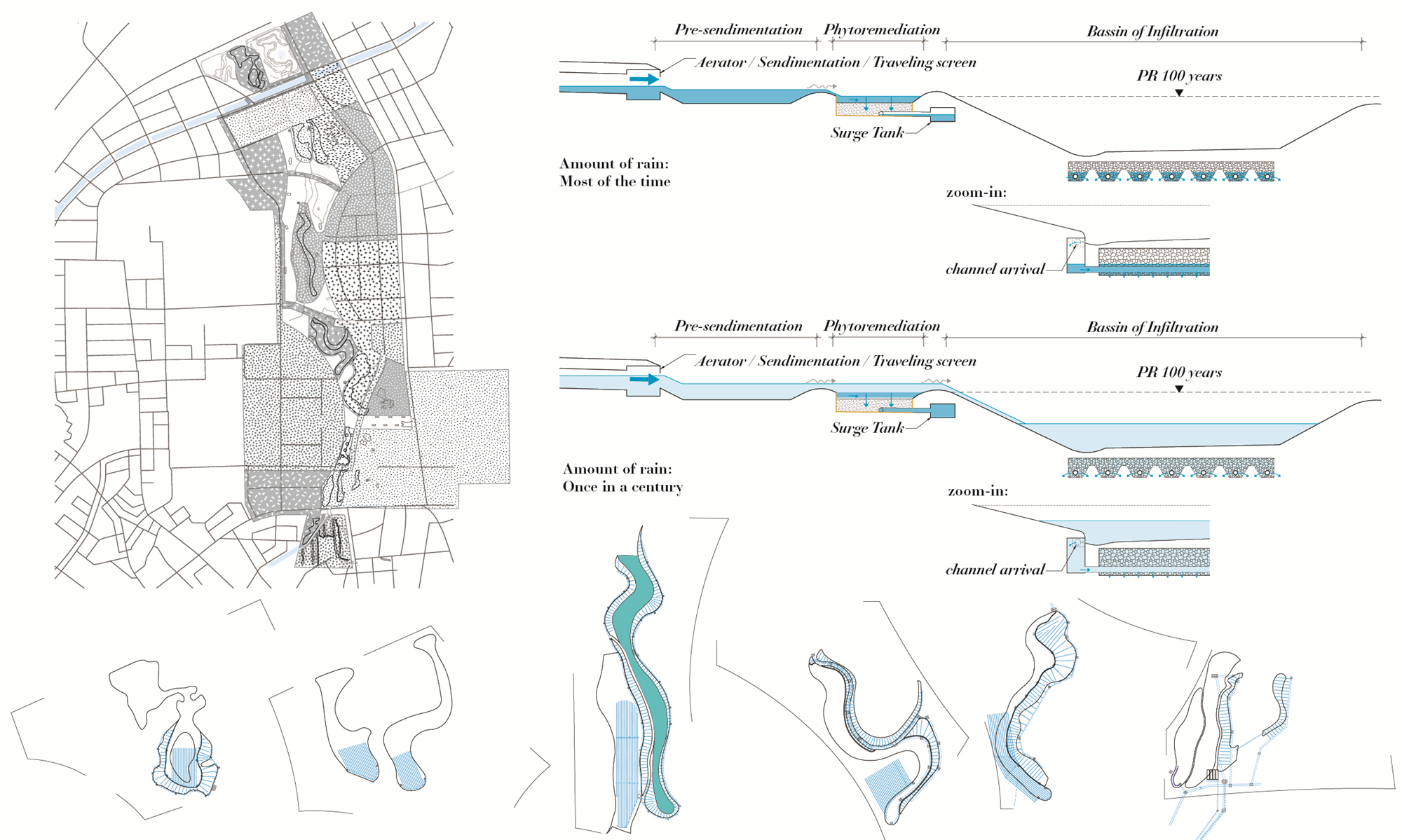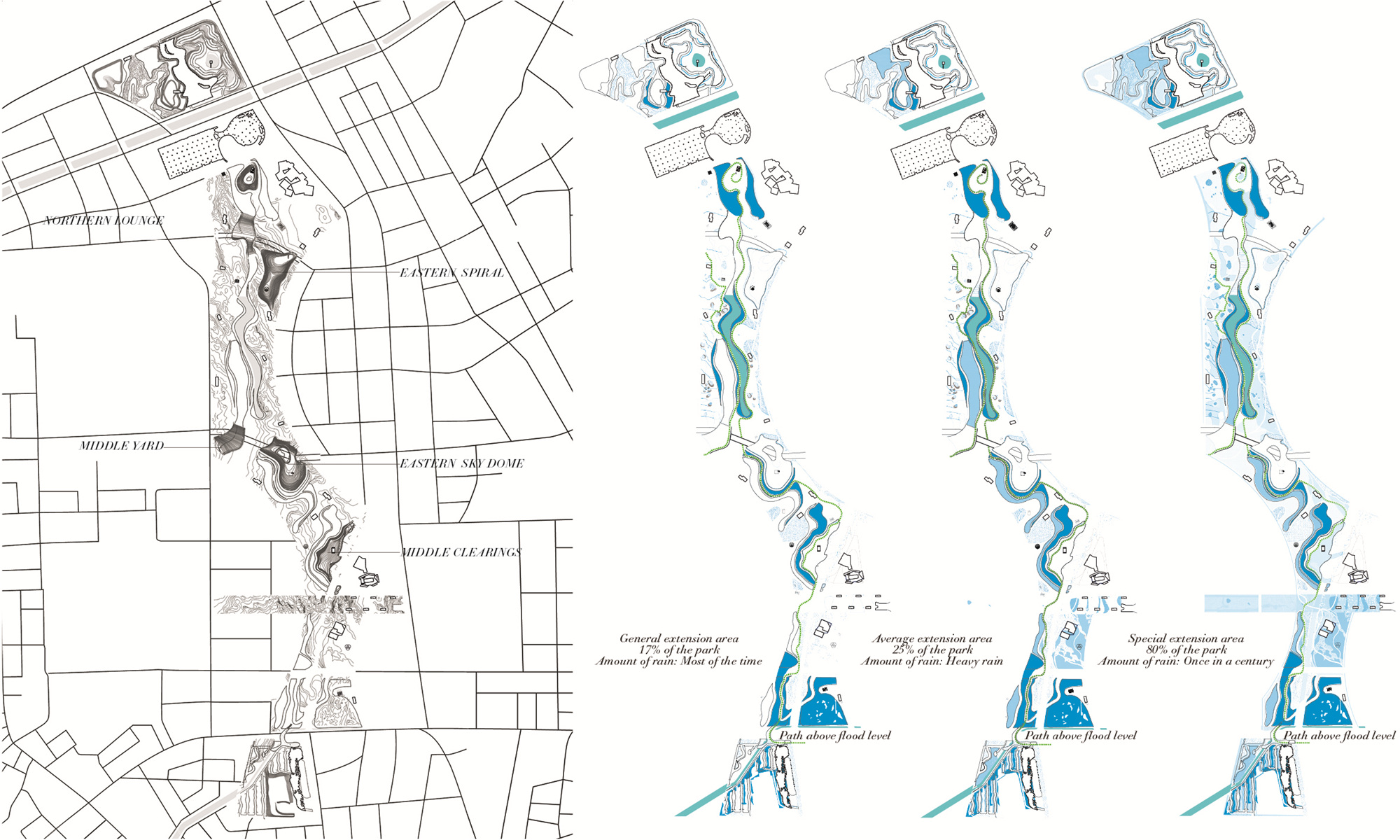 The flow of rain water is directed to a mesh of topographic beds. This encourages the versatility of recreational appropriation during dry periods, while the morphing of the landscape permits full saturation during the monsoon. Water thus choreographs the park as much by its recreational possibilities as by its morphological capacities calibrating the seasons from wet to dry. A walkway above flood level guides visitors through all stages, whatever the climatic situation.