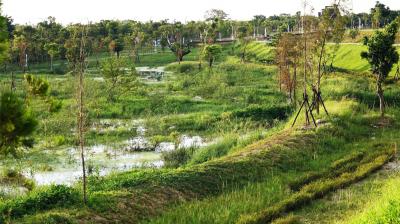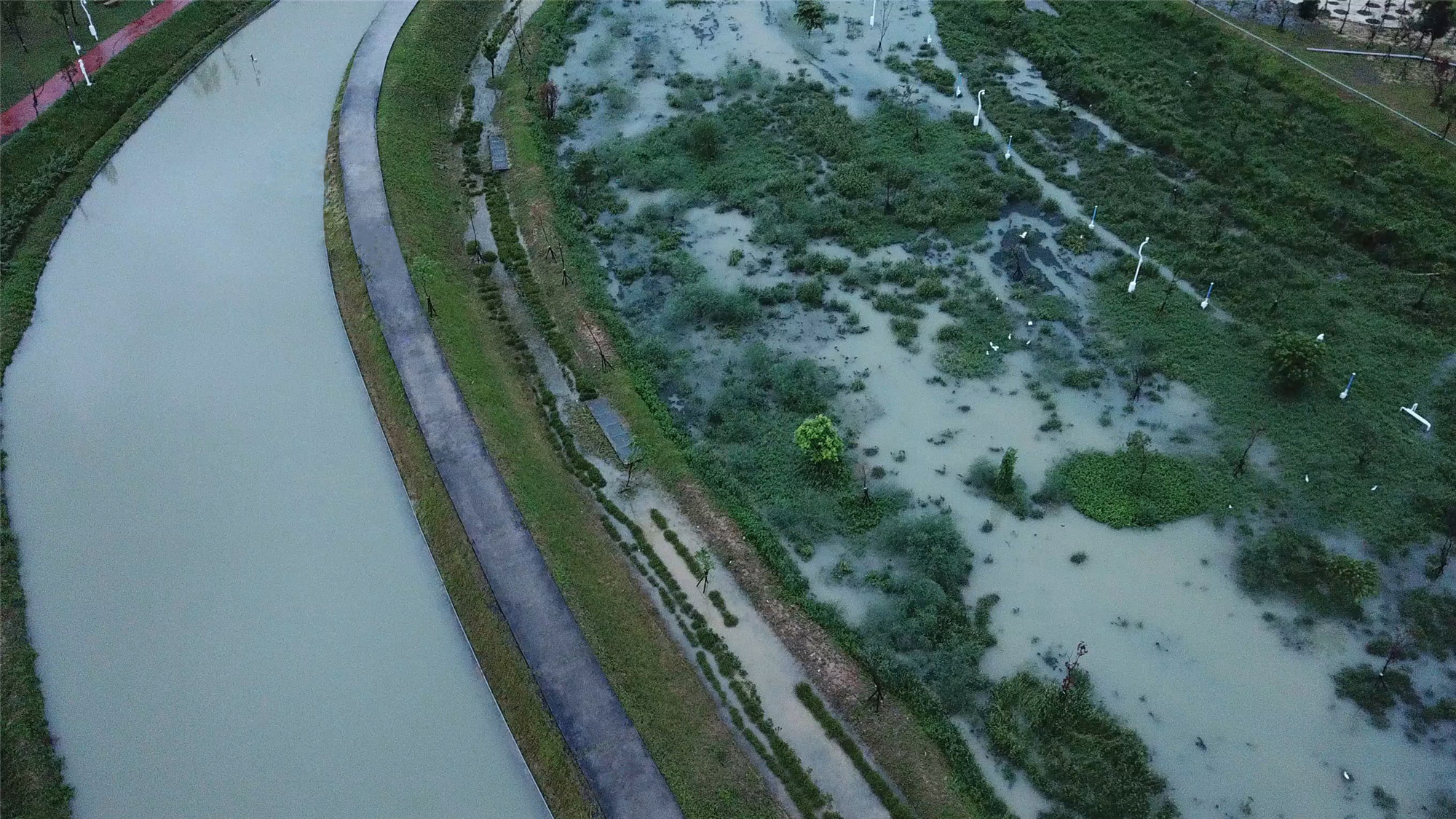 網(wǎng)狀的地形床收集雨水徑流,干旱時(shí)期可作為休閑活動(dòng)的場地,而雨季可以充分容納雨水。利用水的游憩功能和形態(tài)特征,設(shè)計(jì)師組織了公園內(nèi)干濕兩季的空間。一條高于洪水位的步行道橫跨全園,無論什么季節(jié)都能引導(dǎo)游客觀賞園內(nèi)景色。