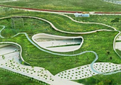 The landscape pulls from North to South. Urban traffic is partially covered by infrastructures incorporated into the ground of the park. On the surface the hills establish a framework of vast horizons and continuities from North to South. Yet standing before them, they are also intimate and protective, for the staging of cultural events or regular shelter with Northern Lounge, Eastern Spiral, Middle Yard, Eastern Sky dome and Middle Clearings.