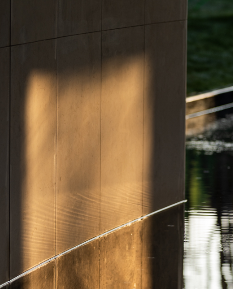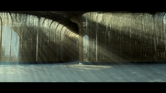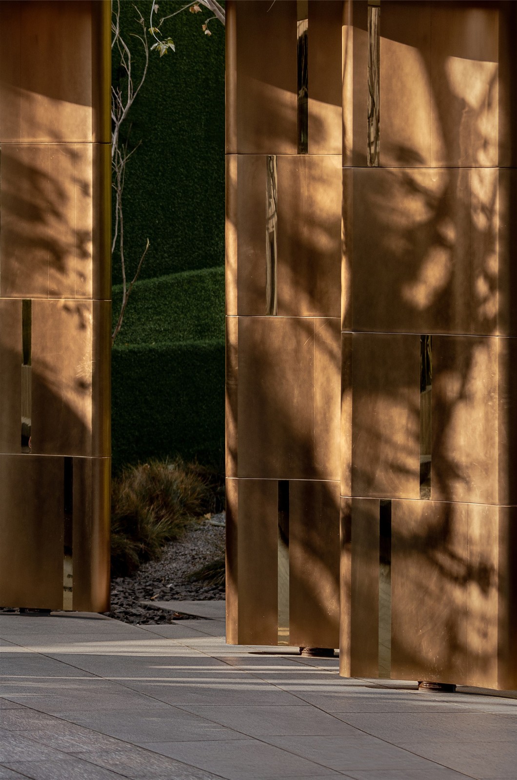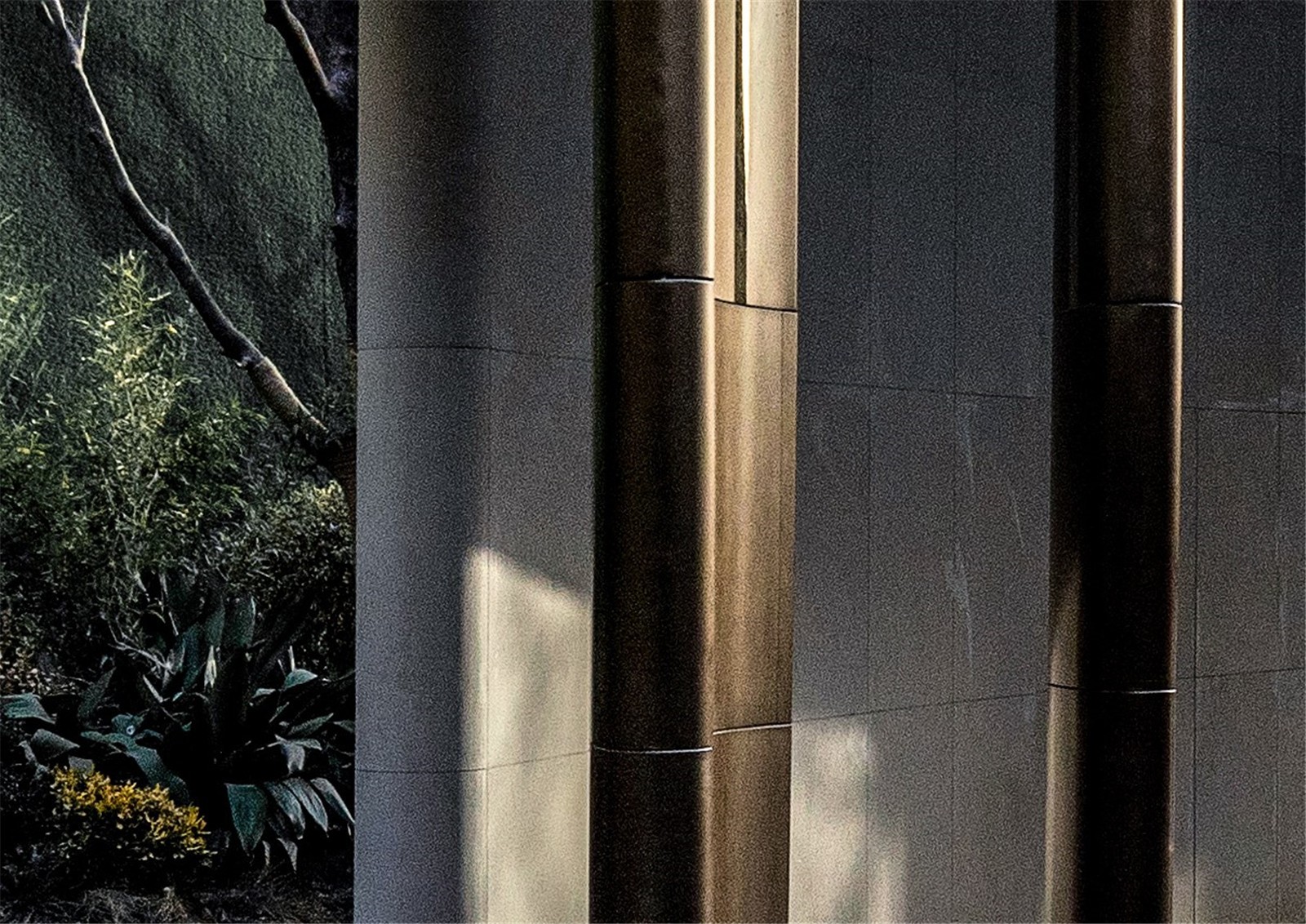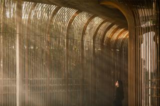 在空間的行進(jìn)中,“密度”將影響感官體驗(yàn),我們希望它不是密集的,或是開闊的。主入口通道巧取竹林簇聚生長(zhǎng)的自然形態(tài),創(chuàng)造空間“透視”的層次。當(dāng)陽(yáng)光傾灑,便出現(xiàn)如同竹林里行走的場(chǎng)景感,形成人、空間、自然的連接。