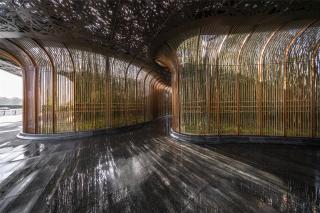 連廊整體采用了竹片設(shè)計(jì),宛若自然的形態(tài),帶來(lái)輕盈愜意的觀感。斜陽(yáng)西下,微醺的空間氛圍,讓居者感受時(shí)間的溫暖。