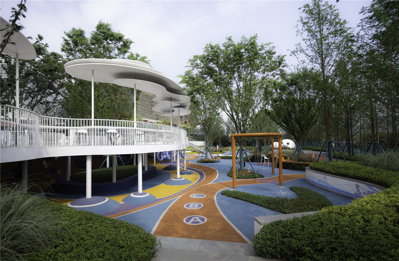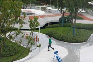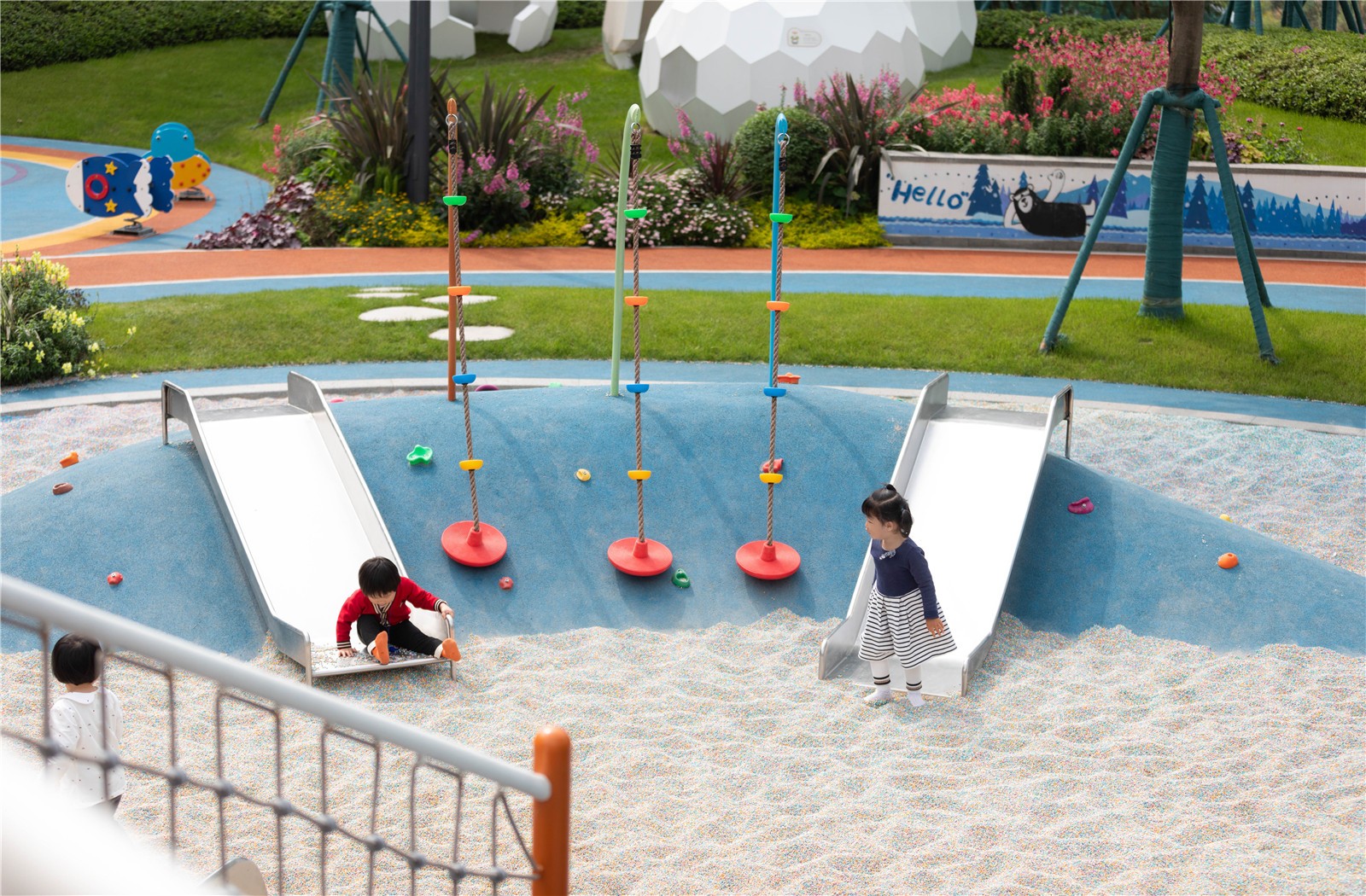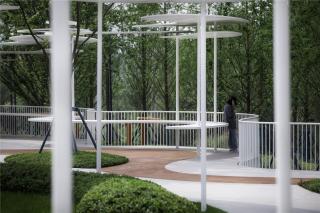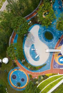 The children’s playground, designed mainly in blue, is inspired by the glacier of the Arctic. Based on flexible space structure and innovative design, and equipped with plank road, interactive landscape wall, sandpit, climbing net, slide, etc., it has become a unique space that accommodates wonderful childhood memories.