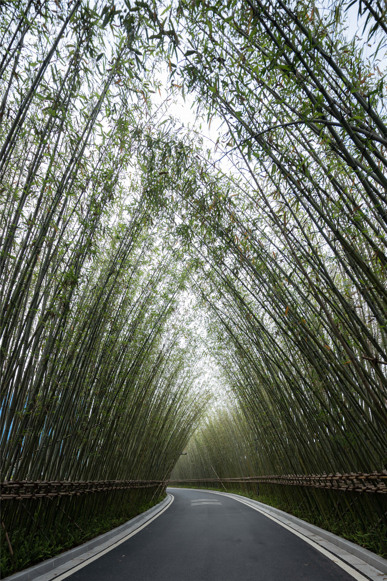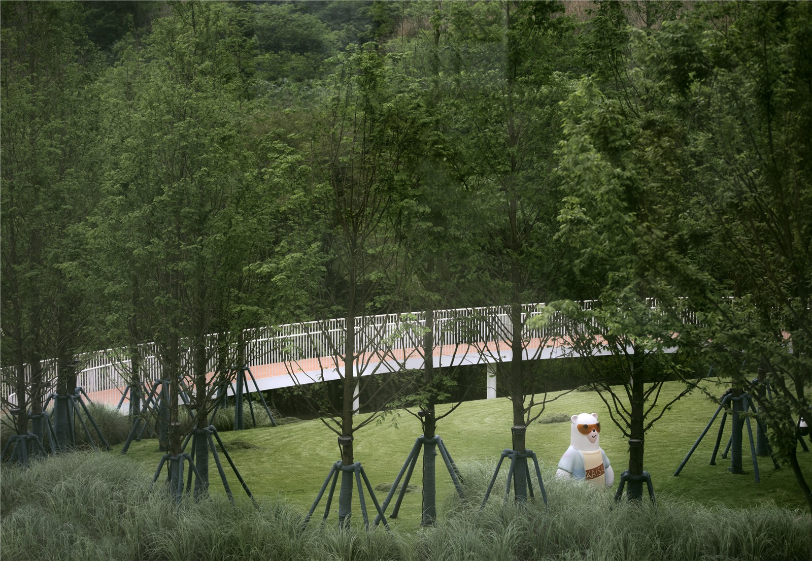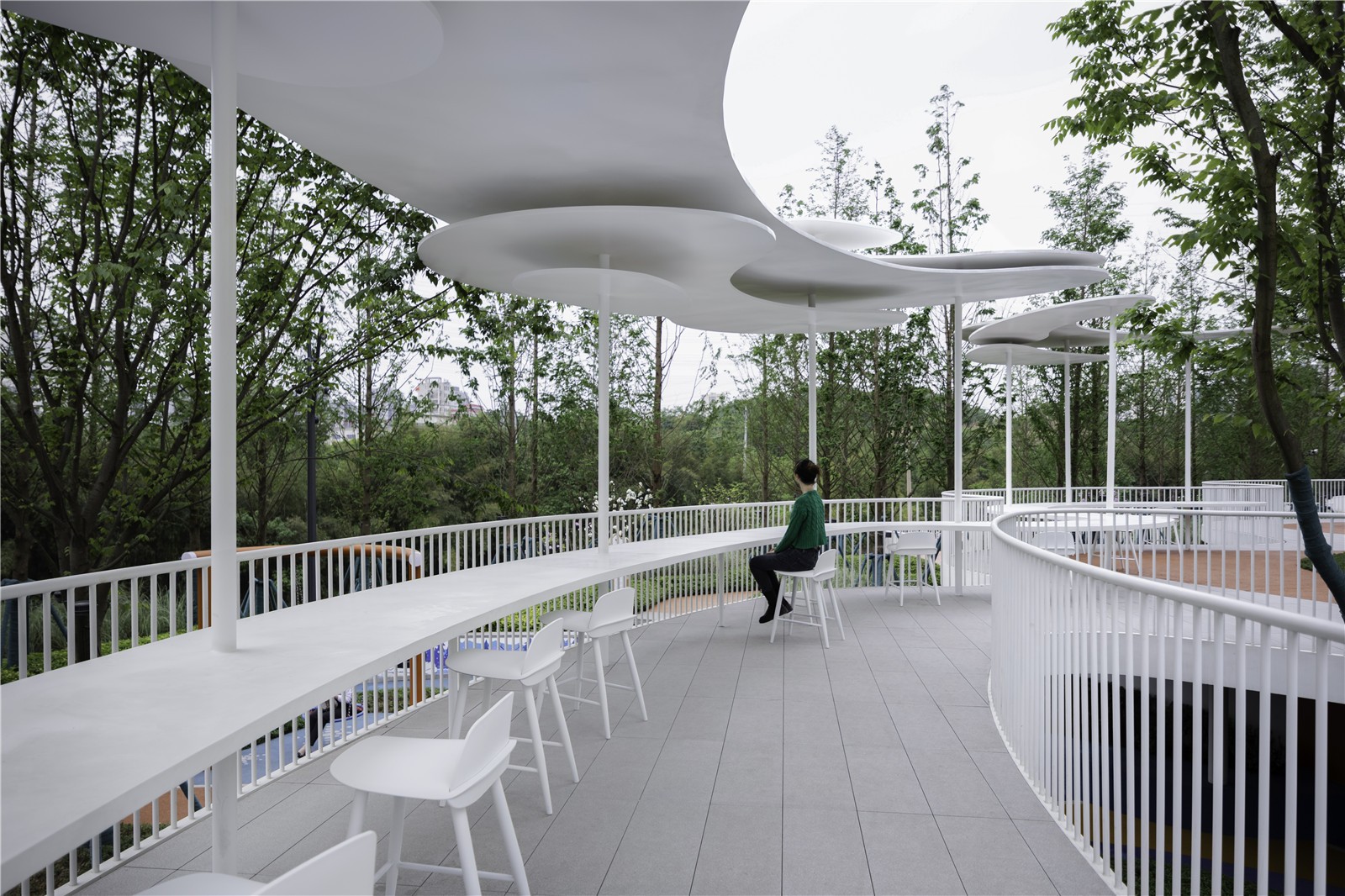 Icicle-inspired white corridor looks elegant and ethereal, which runs up and down like a igloo, providing people with beautiful views and shelters among green trees.