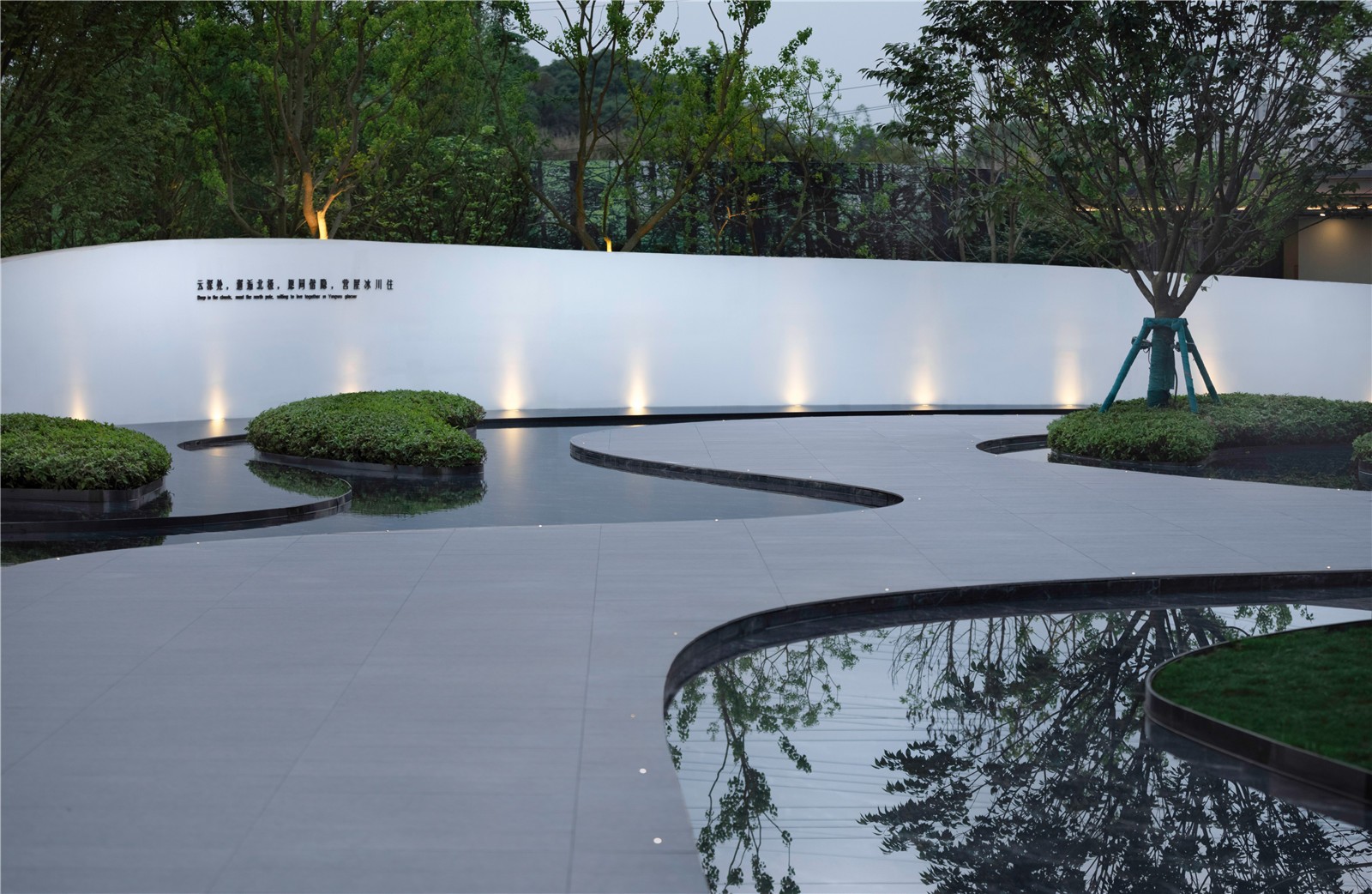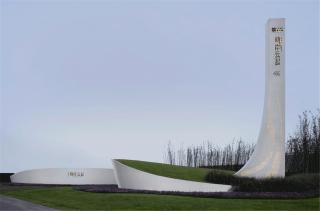 弧形景墻蜿蜒向里,簡潔的白沿著地面無限綿延,構(gòu)成冰原初印象。飄逸的精神堡壘延伸向上,直擊青空,則完成了場地力量的宣示。