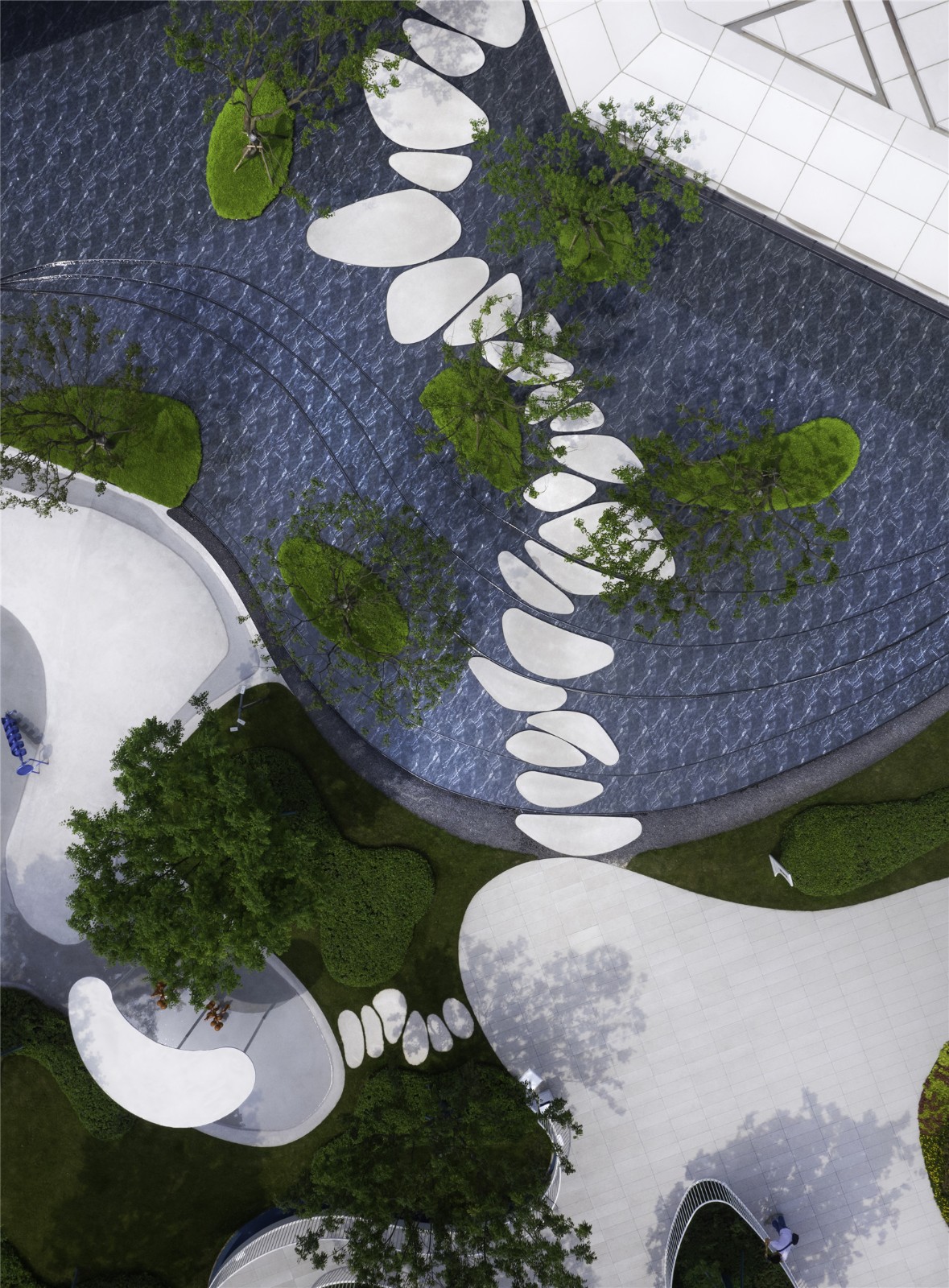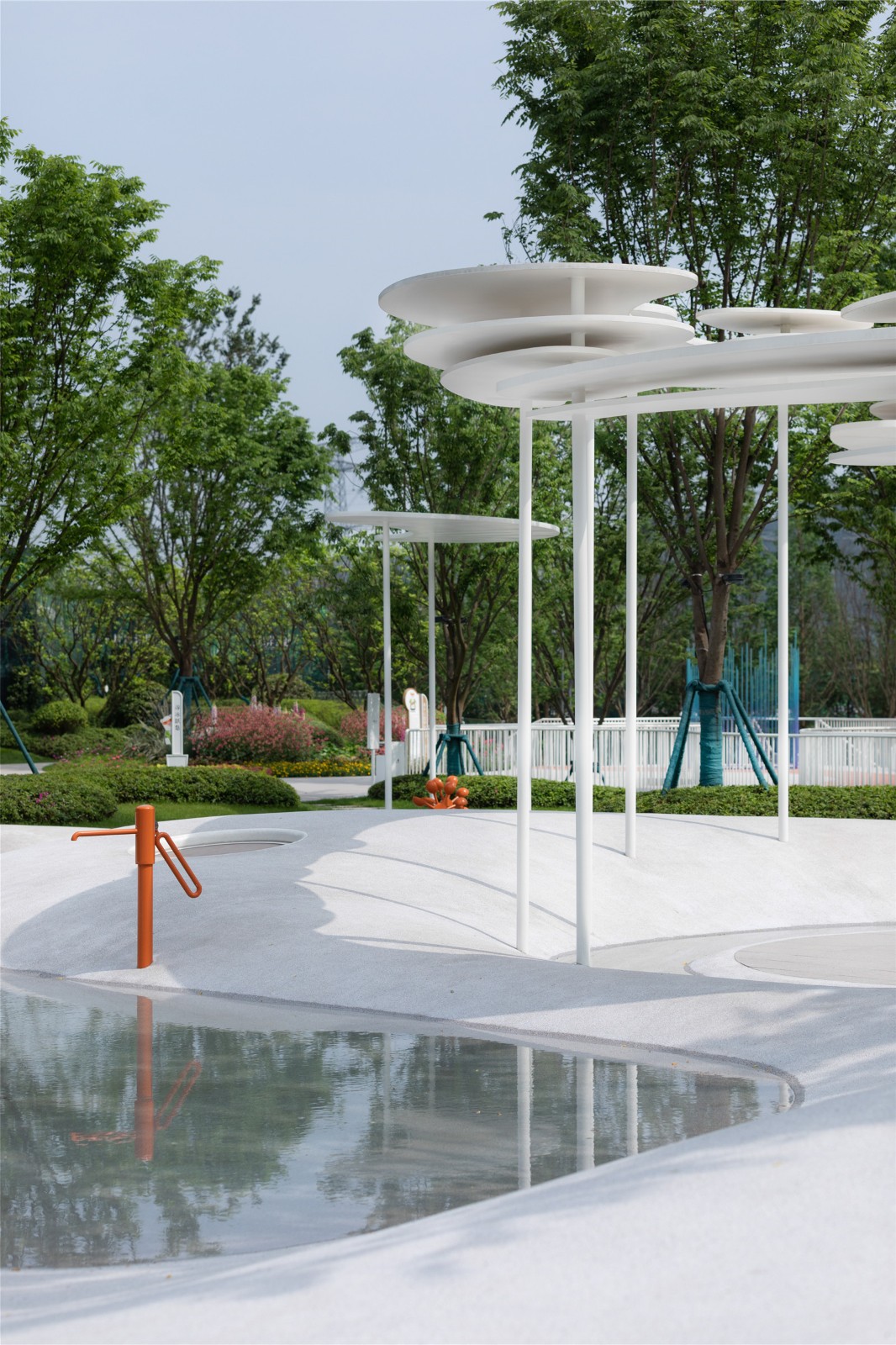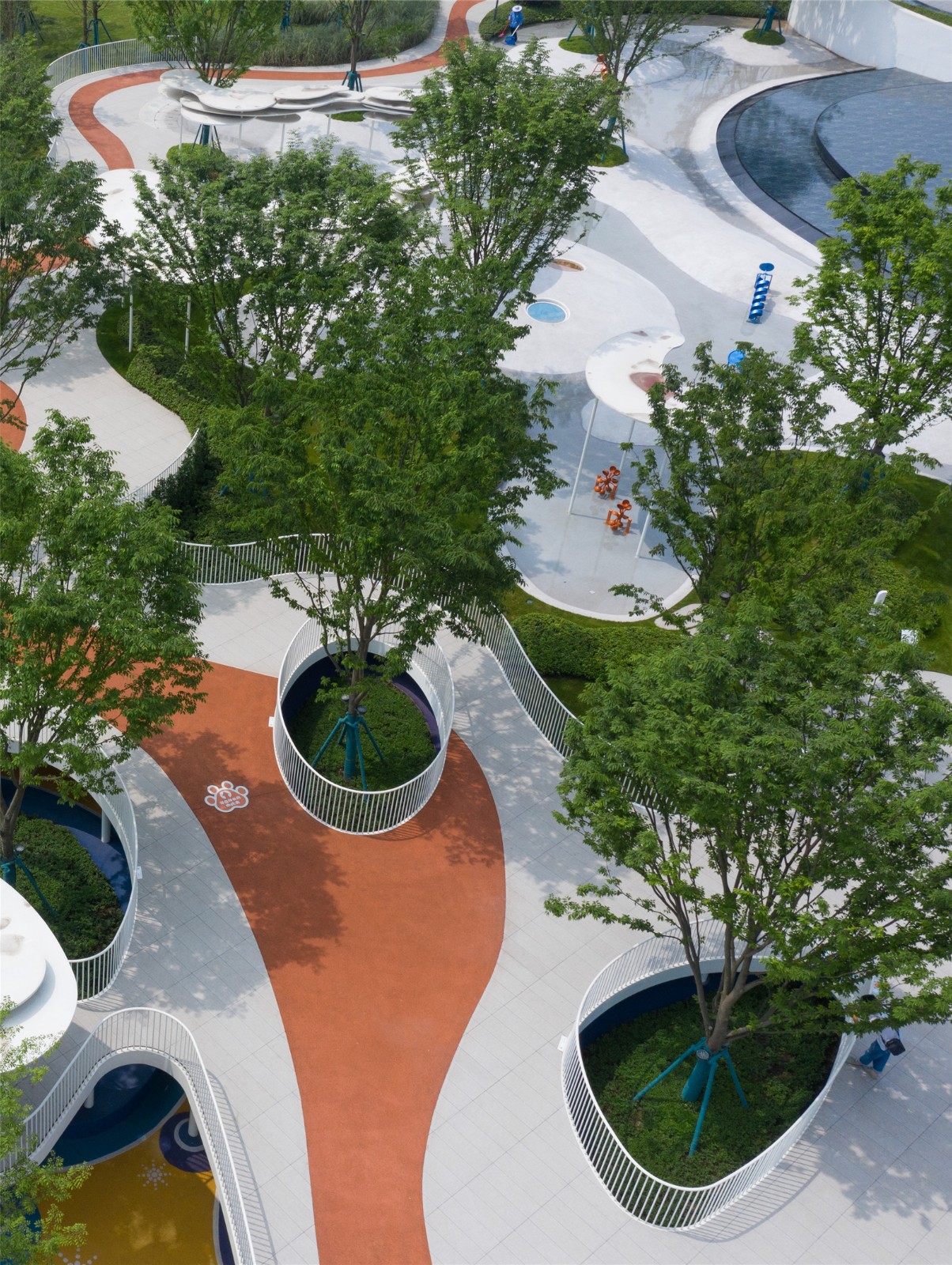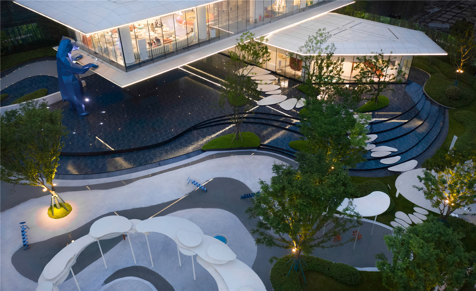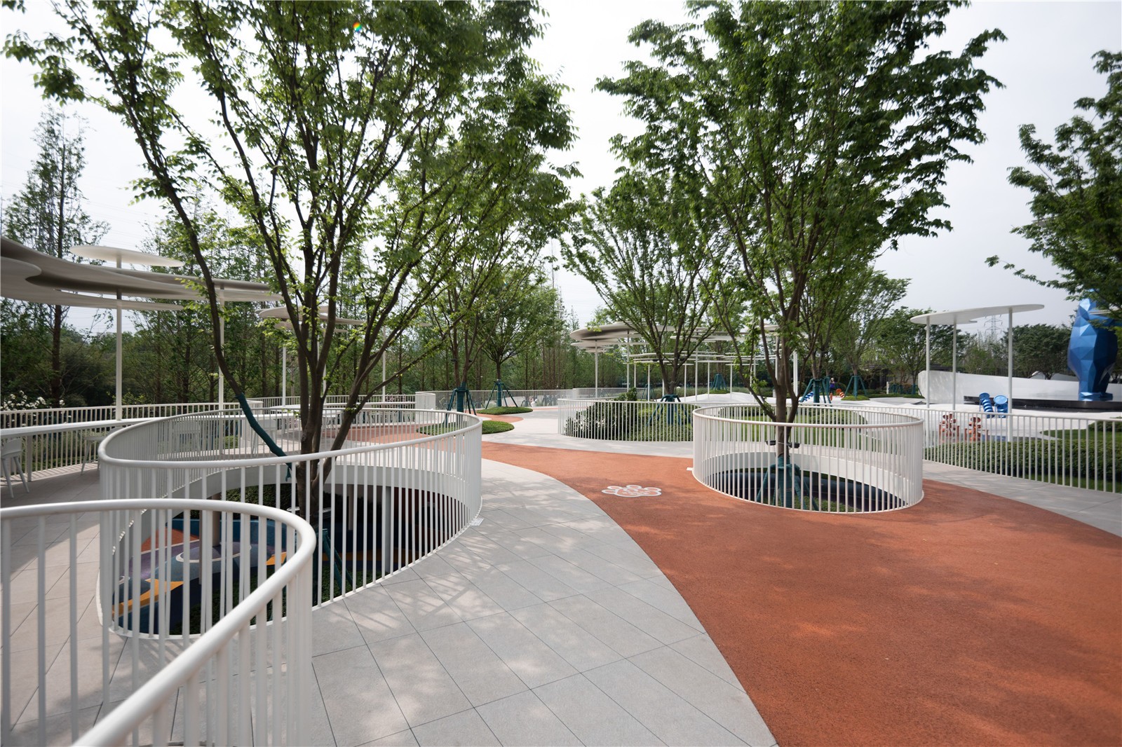 以藍色主打的兒童活動區(qū),從北極冰川中提取靈感,用觀景棧道、互動景墻、沙坑、攀爬網(wǎng)和滑梯等趣味景觀元素,給予場地獨特的記憶點,以豐盛的空間結(jié)構(gòu)與設(shè)計匠心容納孩子們的美好童年。