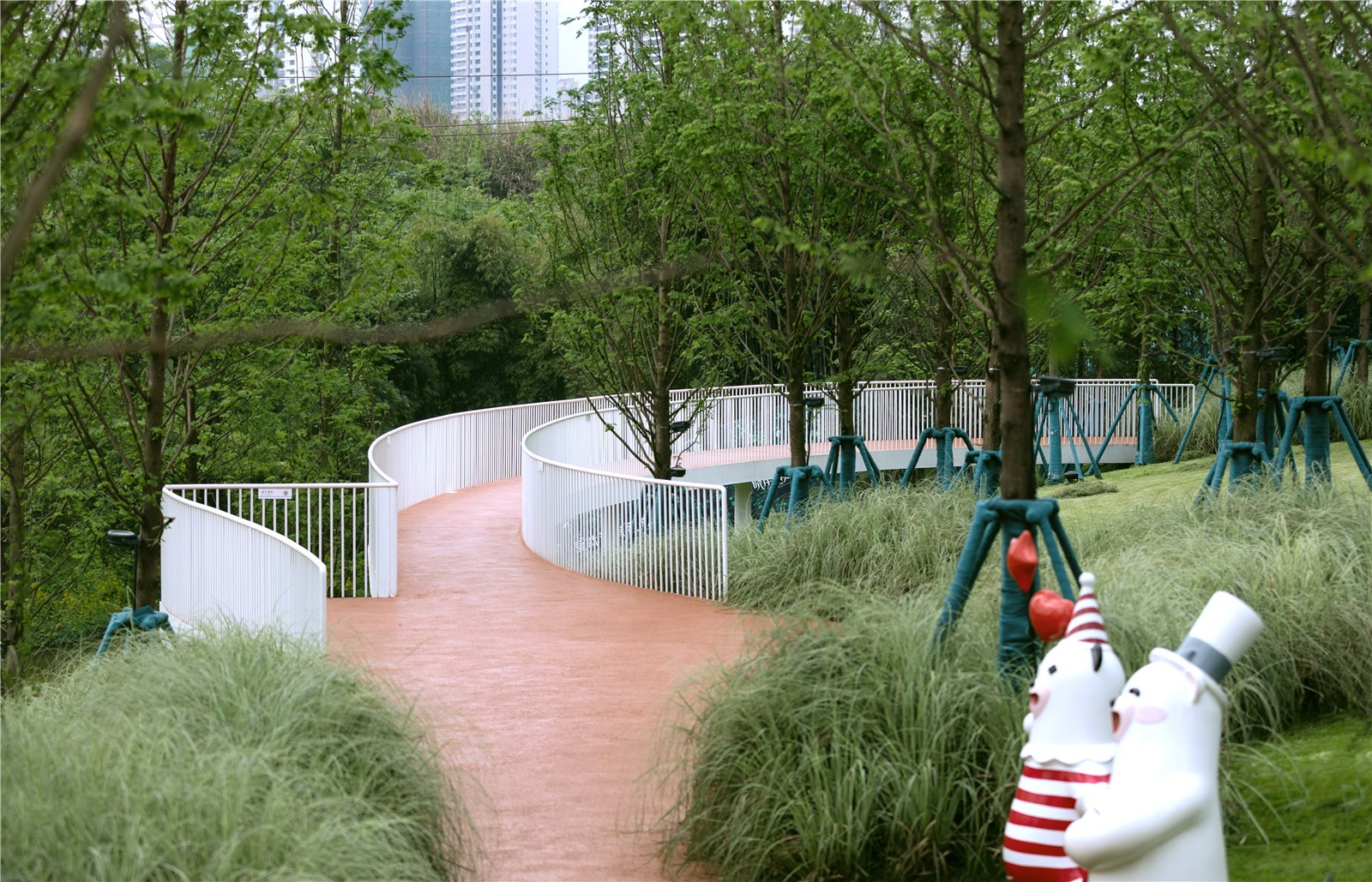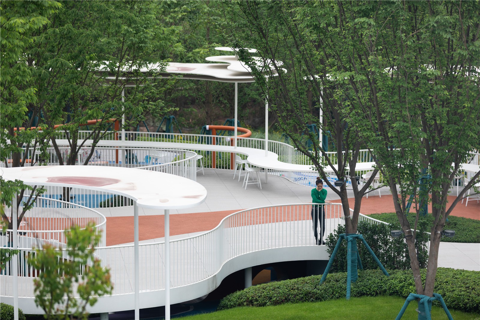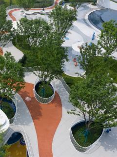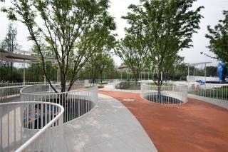 A long red “ribbon” runs along the site, connecting all spaces around the playground. Running or walking along the “ribbon” allows people to have a good view of the surrounding landscapes.