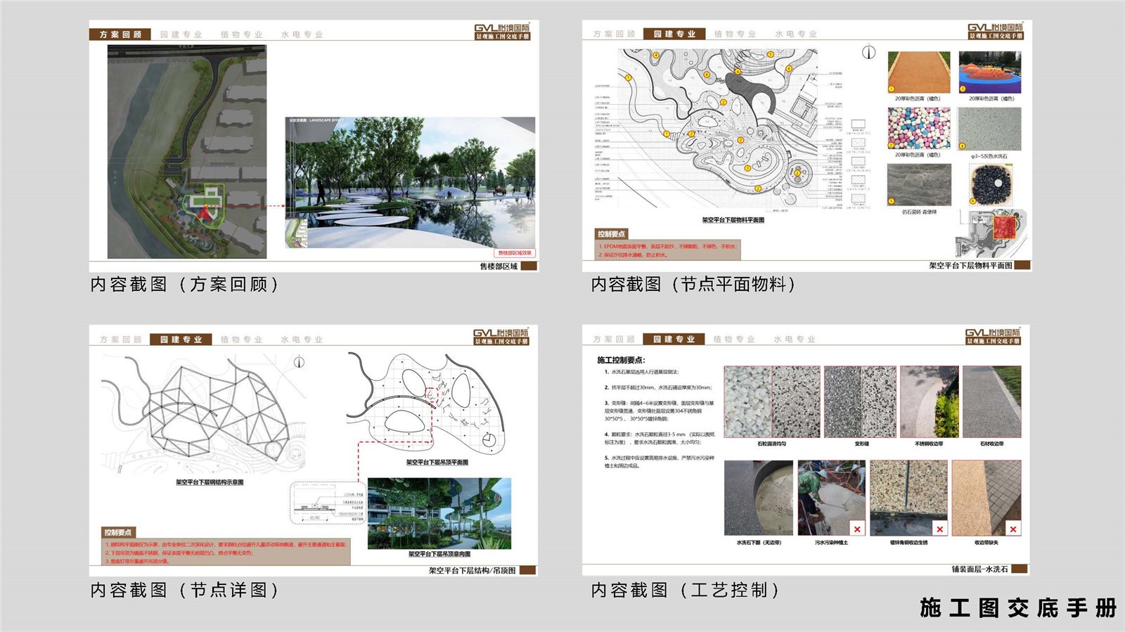 項目設(shè)計落地過程中,基于時間周期及曉岸云起的重要戰(zhàn)略意義考慮,怡境團隊制作針對項目的施工可視化手冊,優(yōu)化了圖紙深度會審、施工圖交底、植物選型、材料定樣、現(xiàn)場跟蹤、復(fù)盤反思等一系列工作流程。解決了如河堤與兒童活動平臺標高、回填和開挖成本、板材結(jié)構(gòu)及厚度要求等多種因素限制,以設(shè)計施工一體化實現(xiàn)了設(shè)計與落地的高效對接,為項目完美高效落地提供了有力支持。