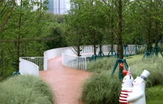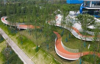 一條紅色飄帶為場地增添了熱烈絢爛的色彩,同時以延展的動勢串聯(lián)起整個場地。人們在紅色飄帶里奔跑活動的同時,能一覽公園周邊的景致。