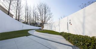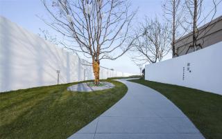 素雅的景墻刻下了時光走過的印記,斑駁的樹影在素雅白墻上畫林,又在肌理中模糊了痕跡。夾道兩側的青翠模糊了墻與天空的邊界,自由展開的枝椏舒展伸向天空,行人穿梭林中,更加靜謐空靈,自然純粹。