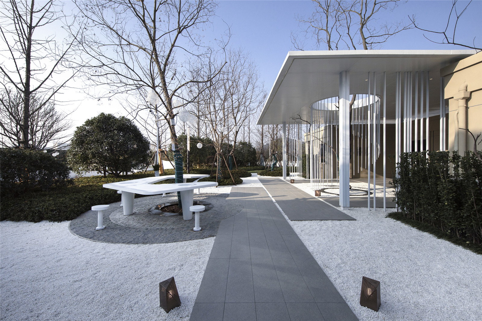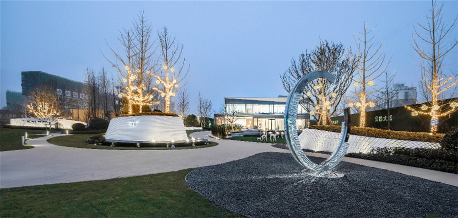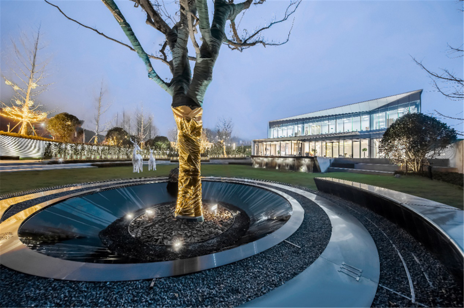 售樓部前場是一片永久性的入口公園,打造一片所見即所得的開放性公共綠地空間。這里有述說時光的記憶之樹,以及兩旁陽光裹挾下的郁郁蔥蔥的銀杏林都傳遞著時與光的印記。樹的周圍是刻著十二時辰的“流水時光漩渦”,矗立在此有一種時空往復錯覺,過去的記憶、當下的生活、未來的期許紛紛跳進這場迷幻。