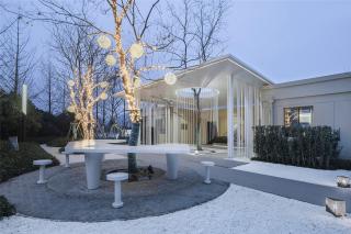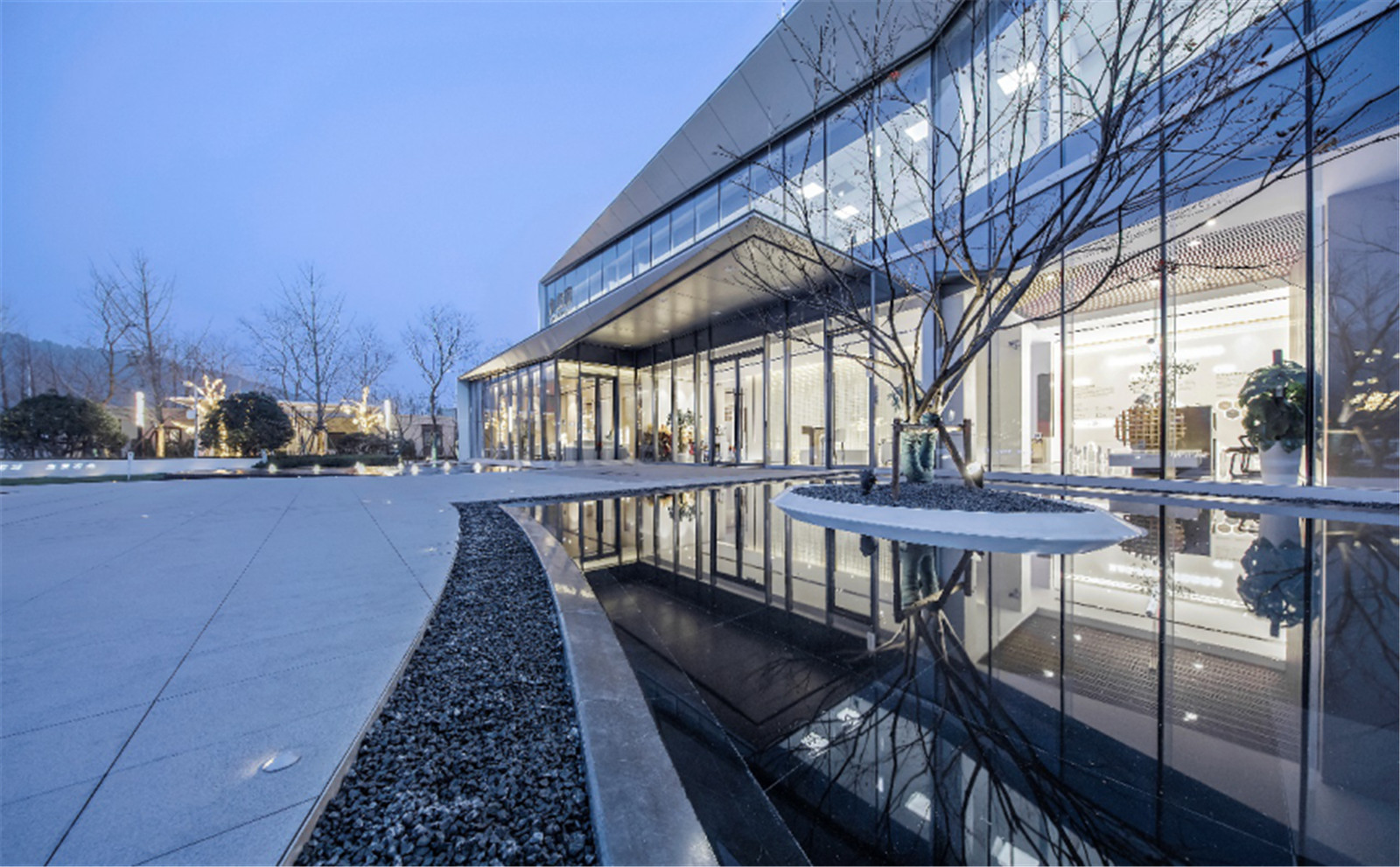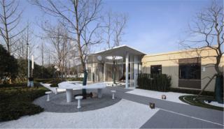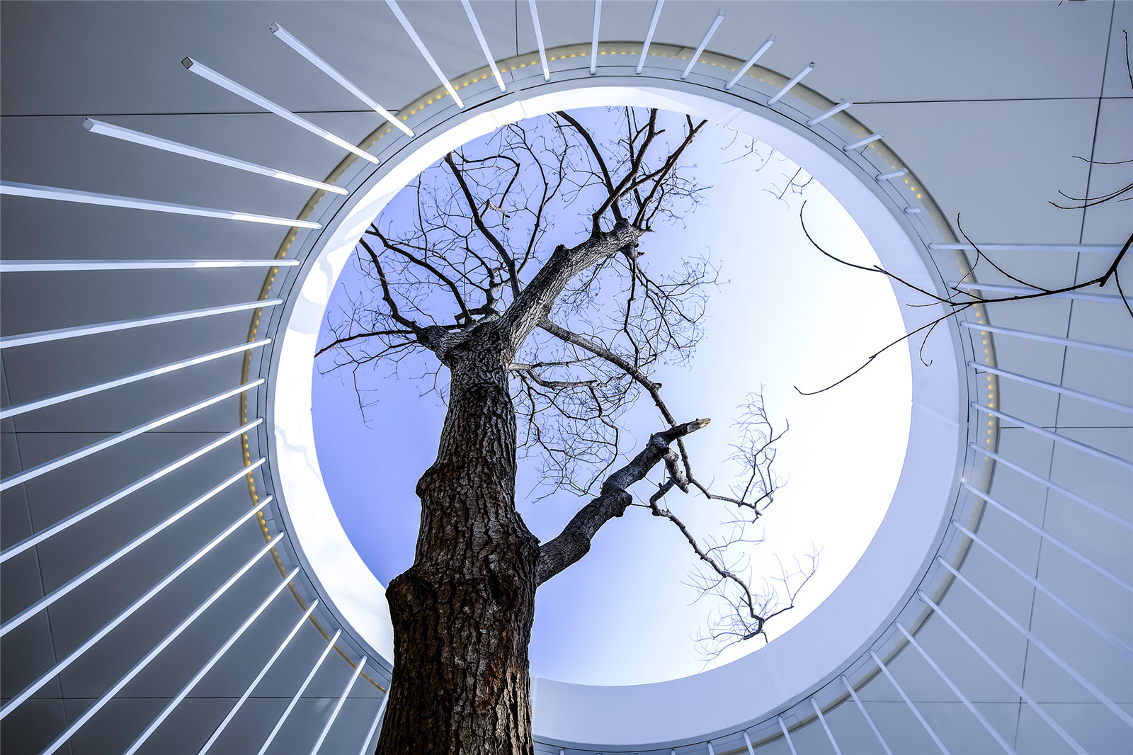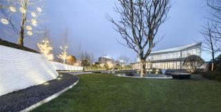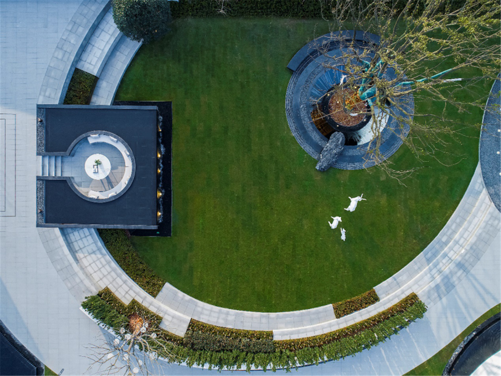 售樓部前場是一片永久性的入口公園,打造一片所見即所得的開放性公共綠地空間。這里有述說時光的記憶之樹,以及兩旁陽光裹挾下的郁郁蔥蔥的銀杏林都傳遞著時與光的印記。樹的周圍是刻著十二時辰的“流水時光漩渦”,矗立在此有一種時空往復錯覺,過去的記憶、當下的生活、未來的期許紛紛跳進這場迷幻。