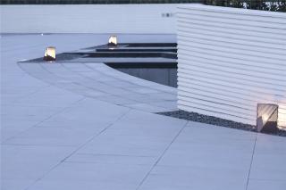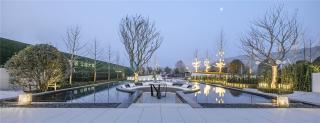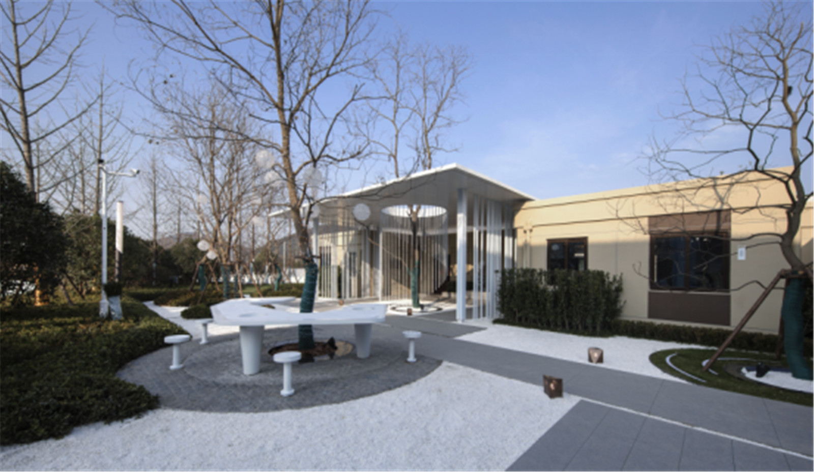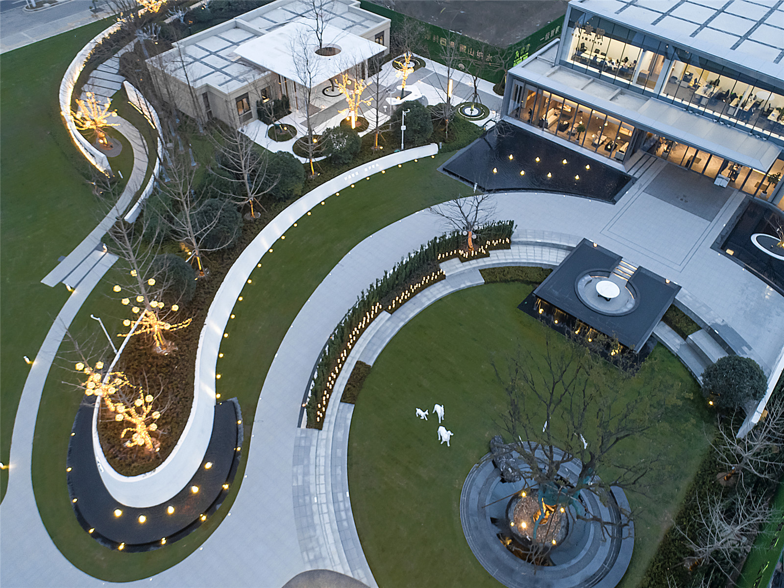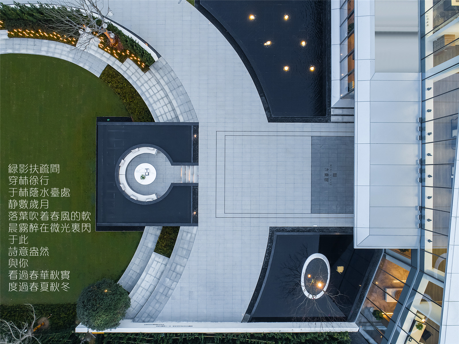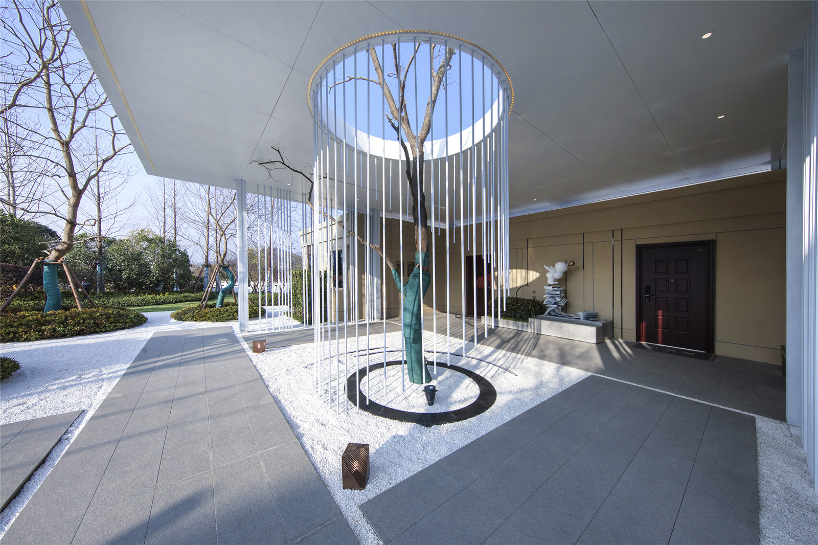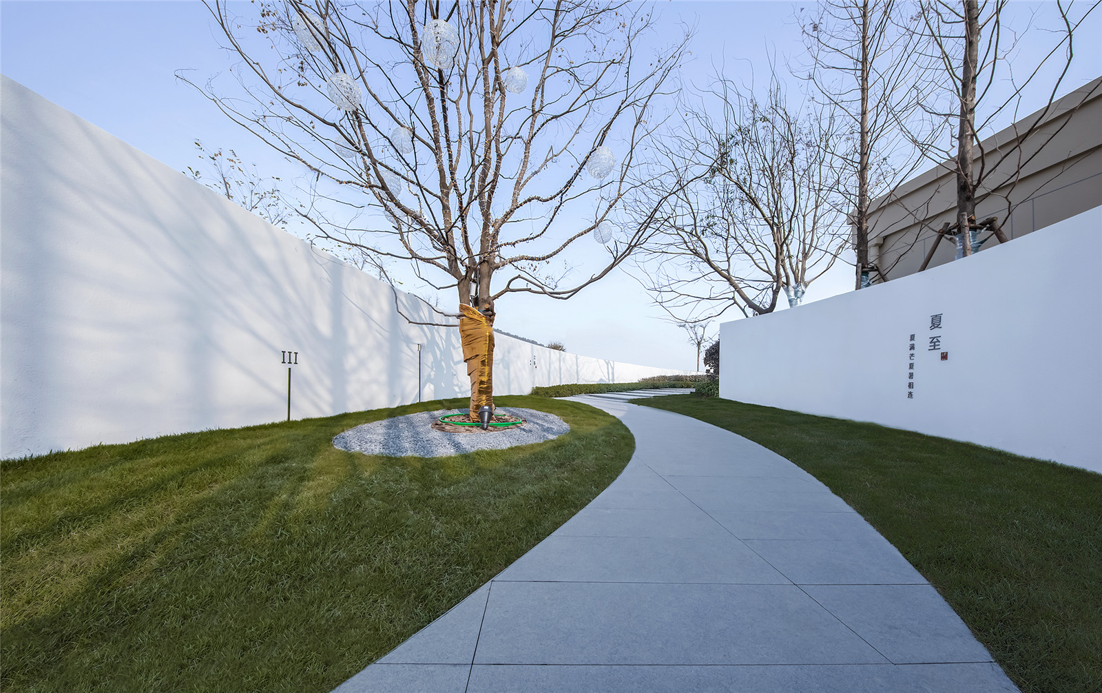 一條純凈白皙的歸家路,幾盞暖馨燈光,烏桕樹頭環(huán)繞星光燈帶,讓歸家仿佛一場穿林踏影之旅。中庭栽得一樹,并配有時光雕塑,搭配潔白的礫石灘營景冬季意境,讓人有如從停車場落客之后,一路走來,從郁郁蔥蔥的林間夾道到潔白冬季意境,猶如穿越了一年四季。