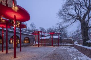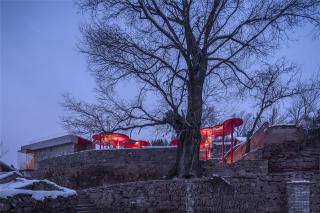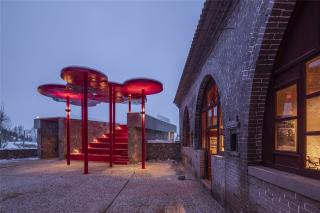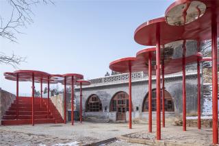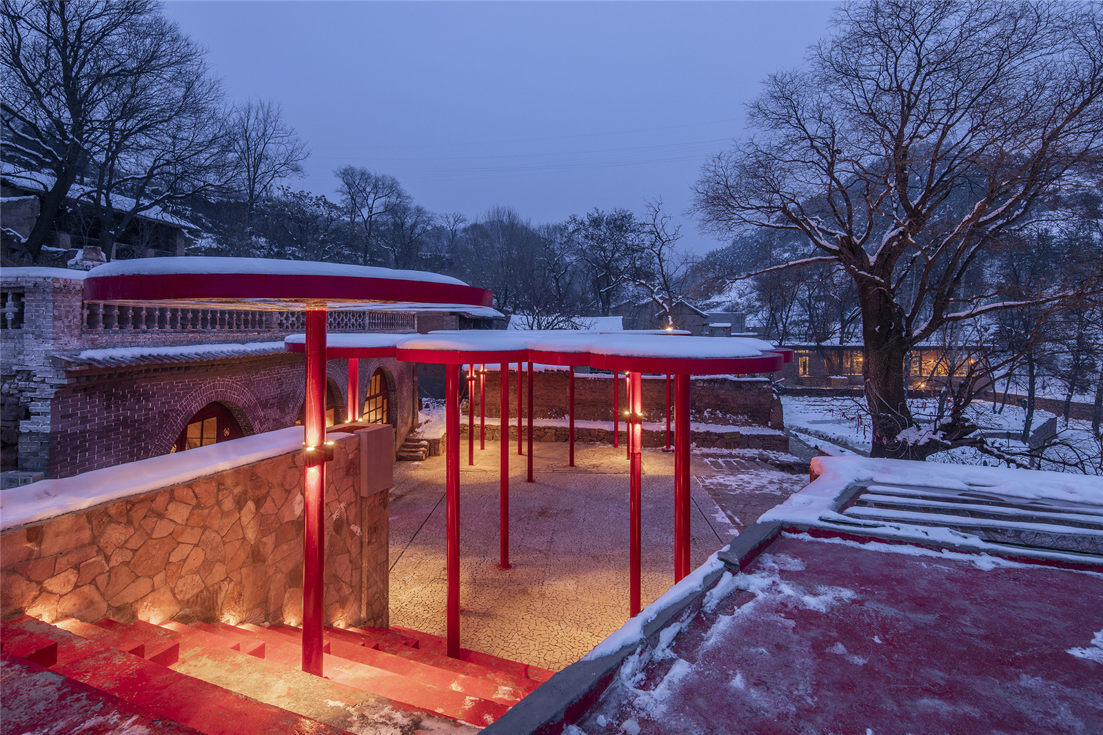 A large number of red elements are used in the space to produce psychological hints of specific themes, while bouncing materials (such as the mirrors under the umbrella-like structures) are added to make the overall atmosphere less serious. There are differences in light and shade between the indoor and outdoor theatre spaces, which respectively correspond to different atmosphere requirements for viewing historical images and performing at present. The low space and earth wall materials in the kiln cave of the village history museum are completely preserved. The customized five-star wall lamp device defines the theme of the space. The internal exhibition collects the old objects and photos in the village, so that visitors can feel more vividly the heavy history borne by the site.